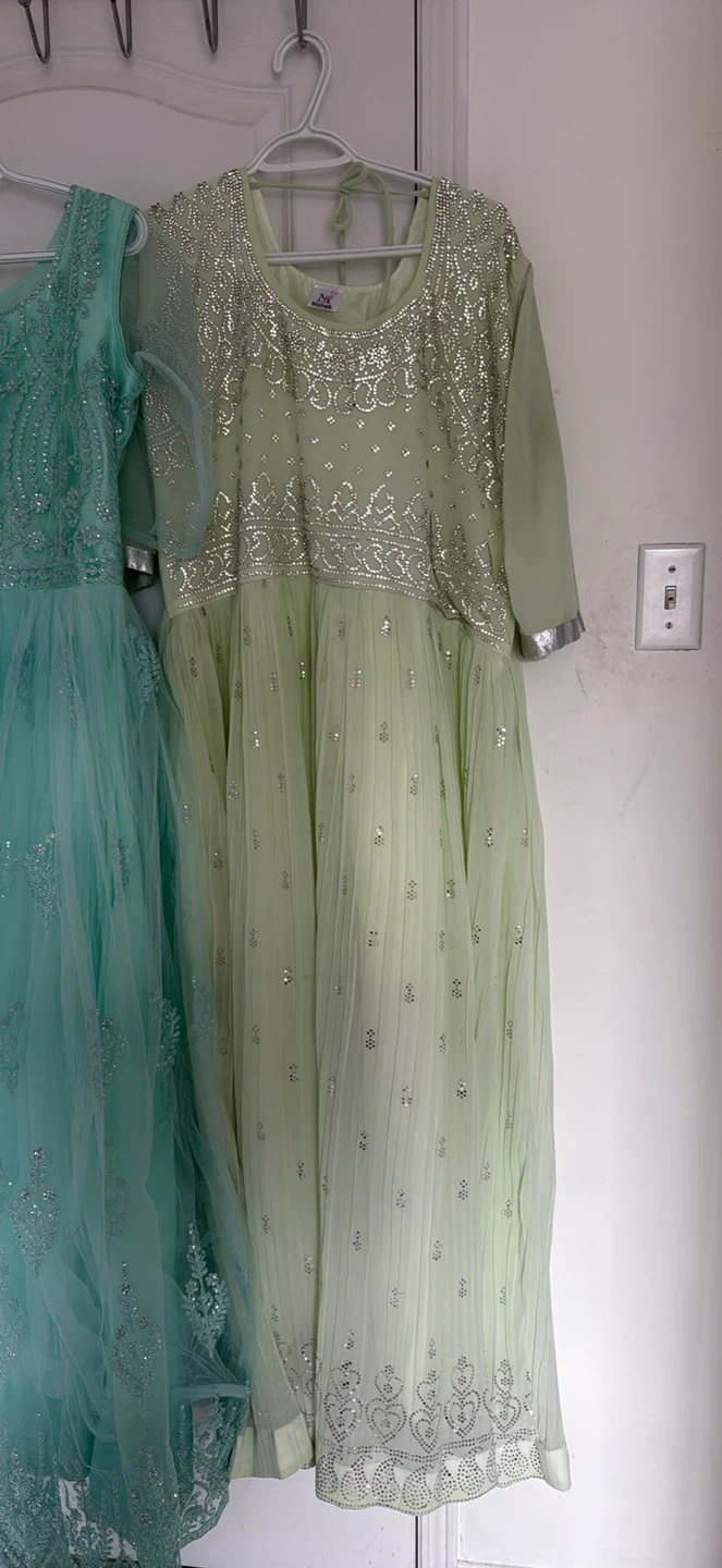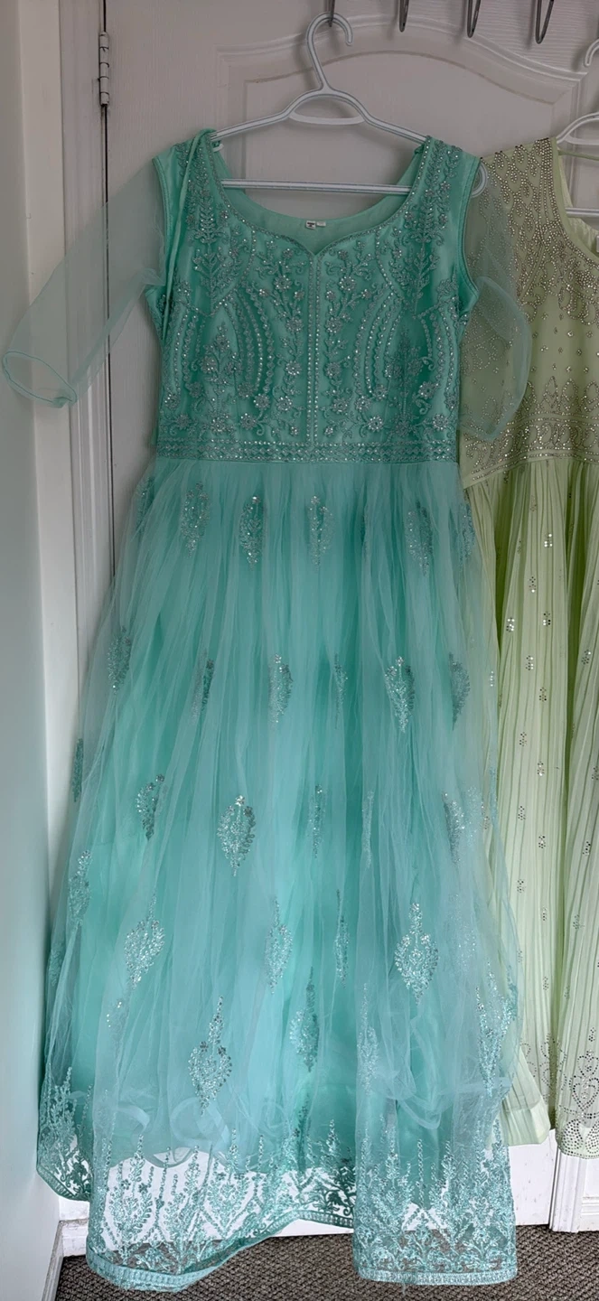 2 Beautiful gorgeous gowns. One aqua color, other light green. Both have shiny silver embroidery and sequin work. Aqua dress has flowy net skirt. Green dress has pleated skirt.