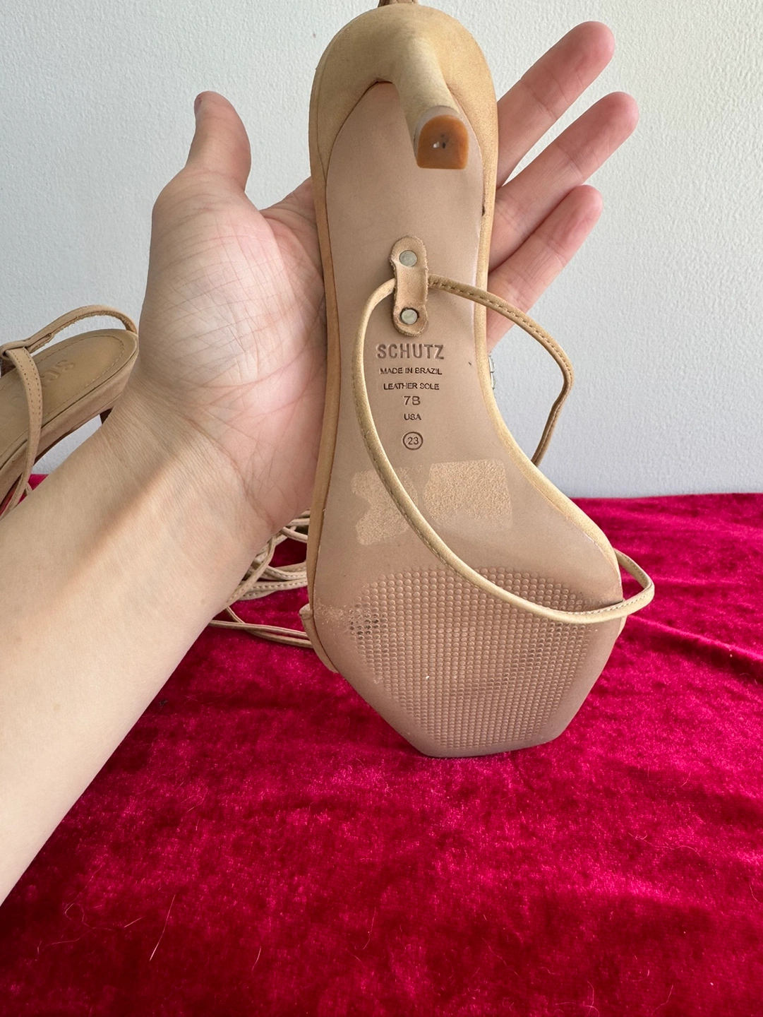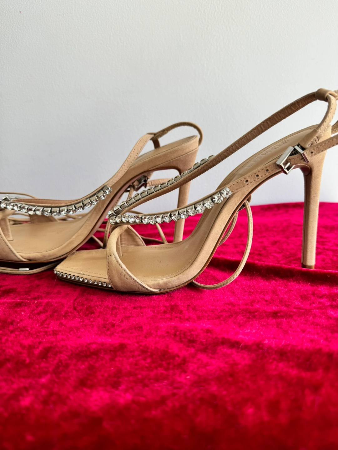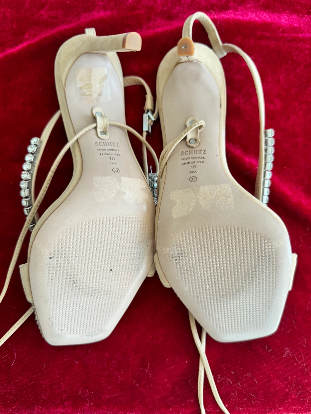 These are beautiful heels with a square toe and a rhinestone detail. They lace up the leg.