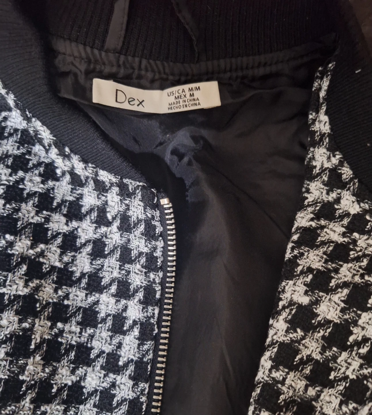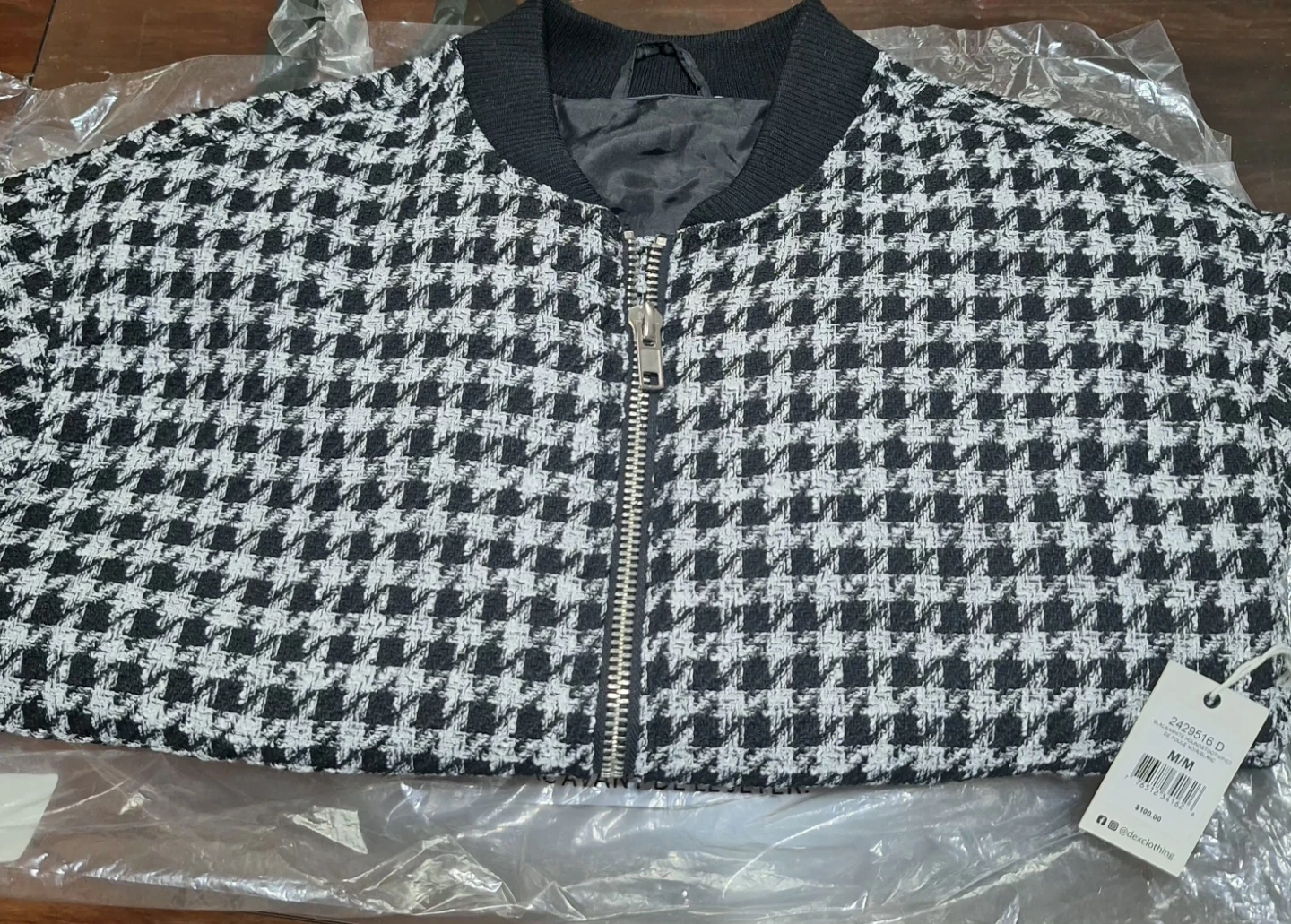 This bomber jacket features a classic houndstooth pattern. It's a stylish piece with a zippered front closure and ribbed cuffs and hem. Made with a textured fabric.