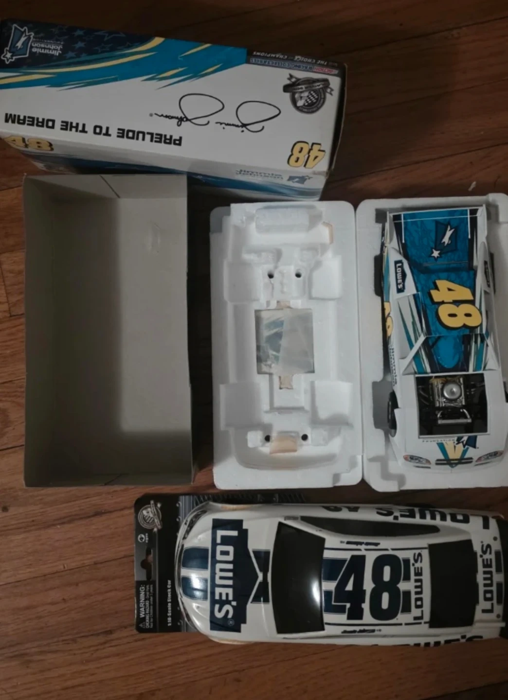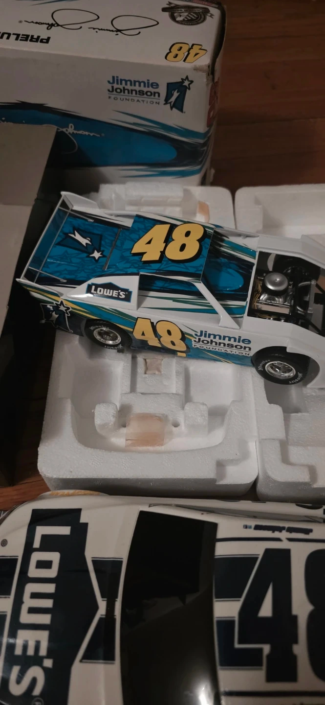 This is a 1:24 scale diecast model of the #48 Lowe's car driven by Jimmie Johnson. It features detailed engine and chassis components. The car comes with its original packaging and display box, which includes Jimmie Johnson's signature. Box has some wear
