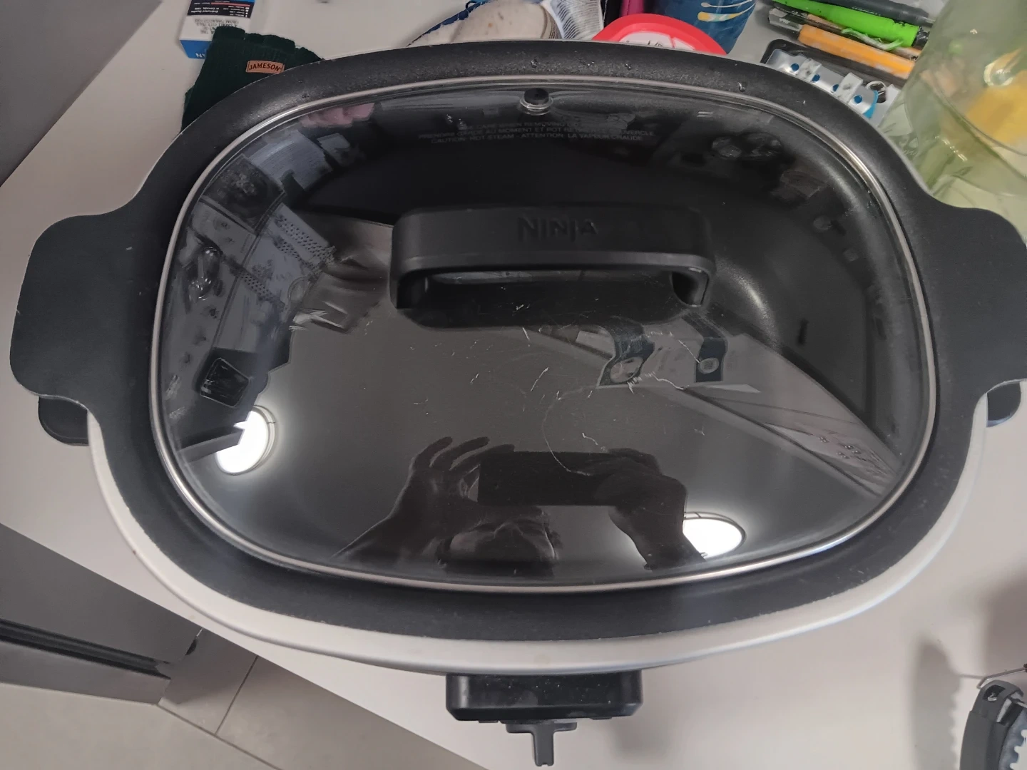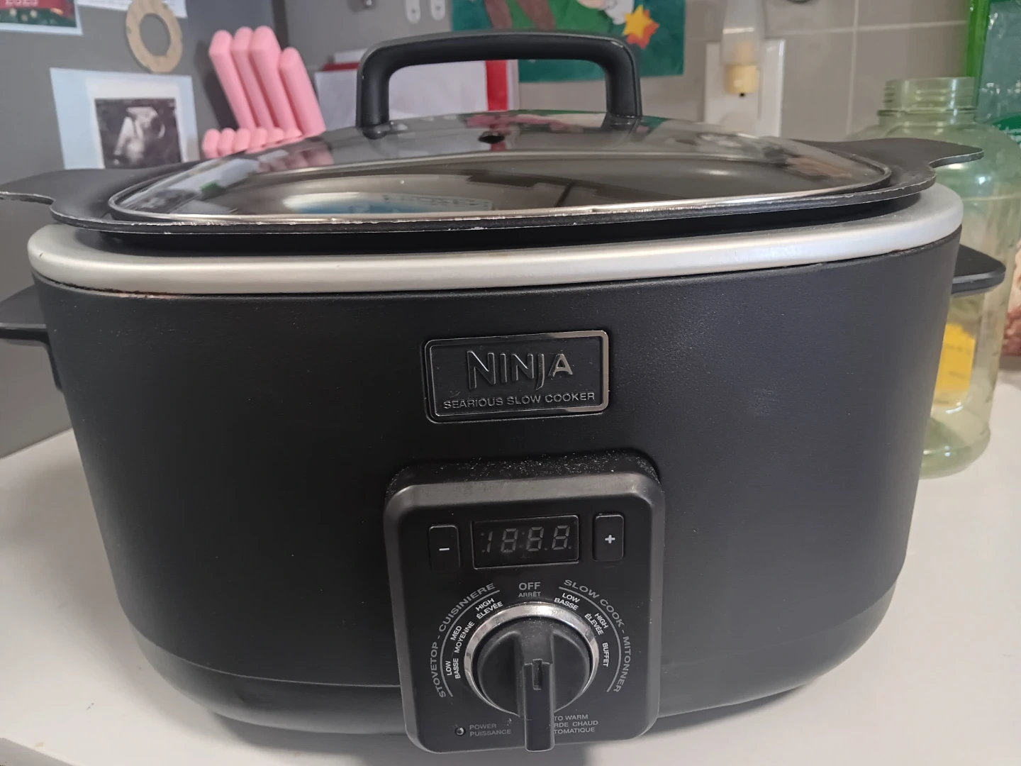 Ninja slow cooker with sear function. Features multiple cooking settings including slow cook, sear, and keep warm. Digital display for easy temperature and time control. Perfect for preparing stews, roasts, and other comforting meals. Few scratches in pot but works perfectly