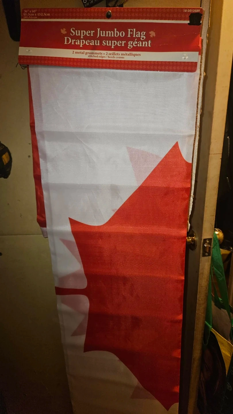 Selling a super jumbo Canadian flag! It measures 36" x 60" (91.5cm x 152.5cm) and has 2 metal grommets. The edges are stitched. Perfect for Canada Day or any patriotic occasion!