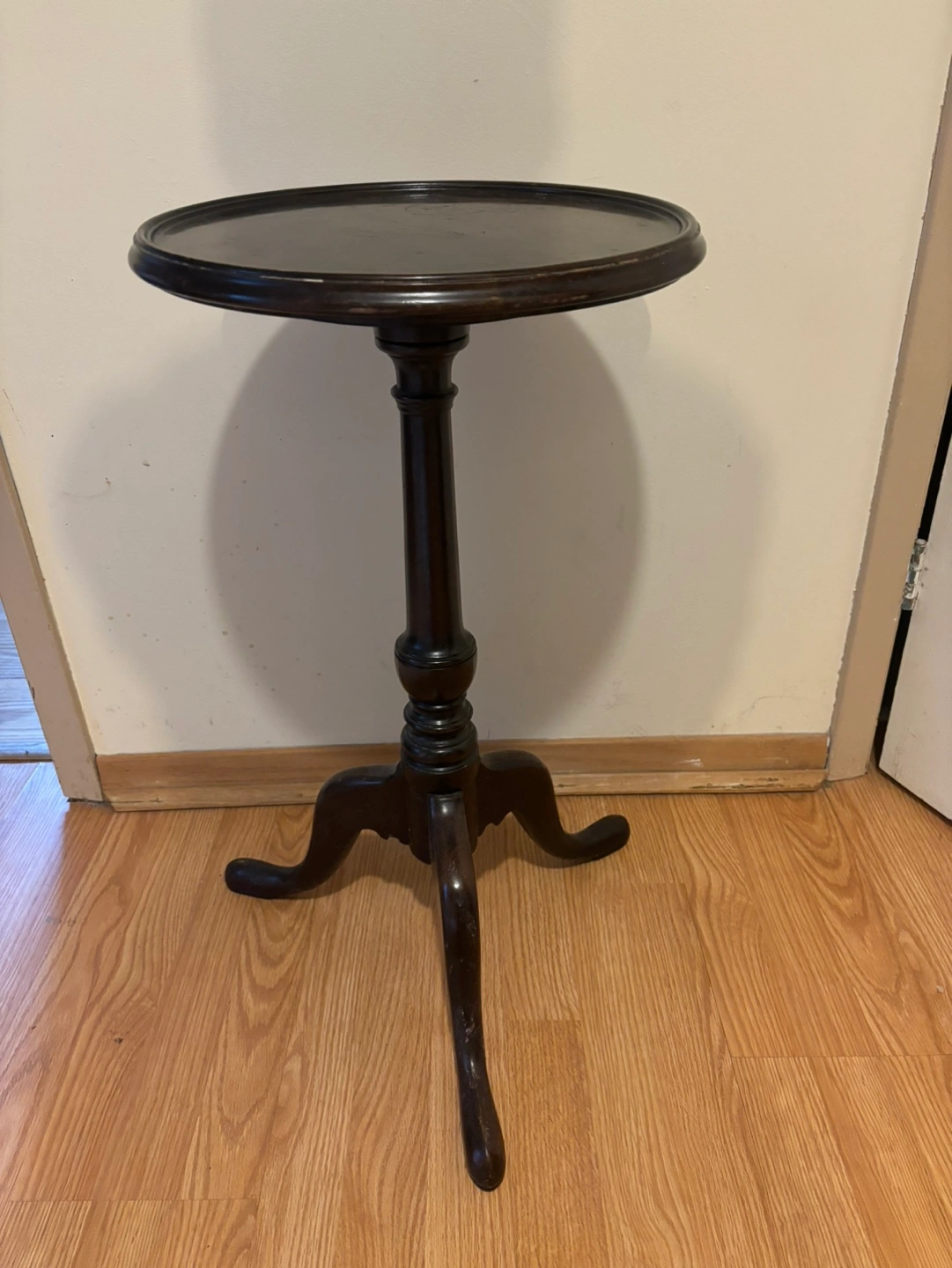 Small, round wooden table with a single pedestal and three legs. Dark brown wood finish.
