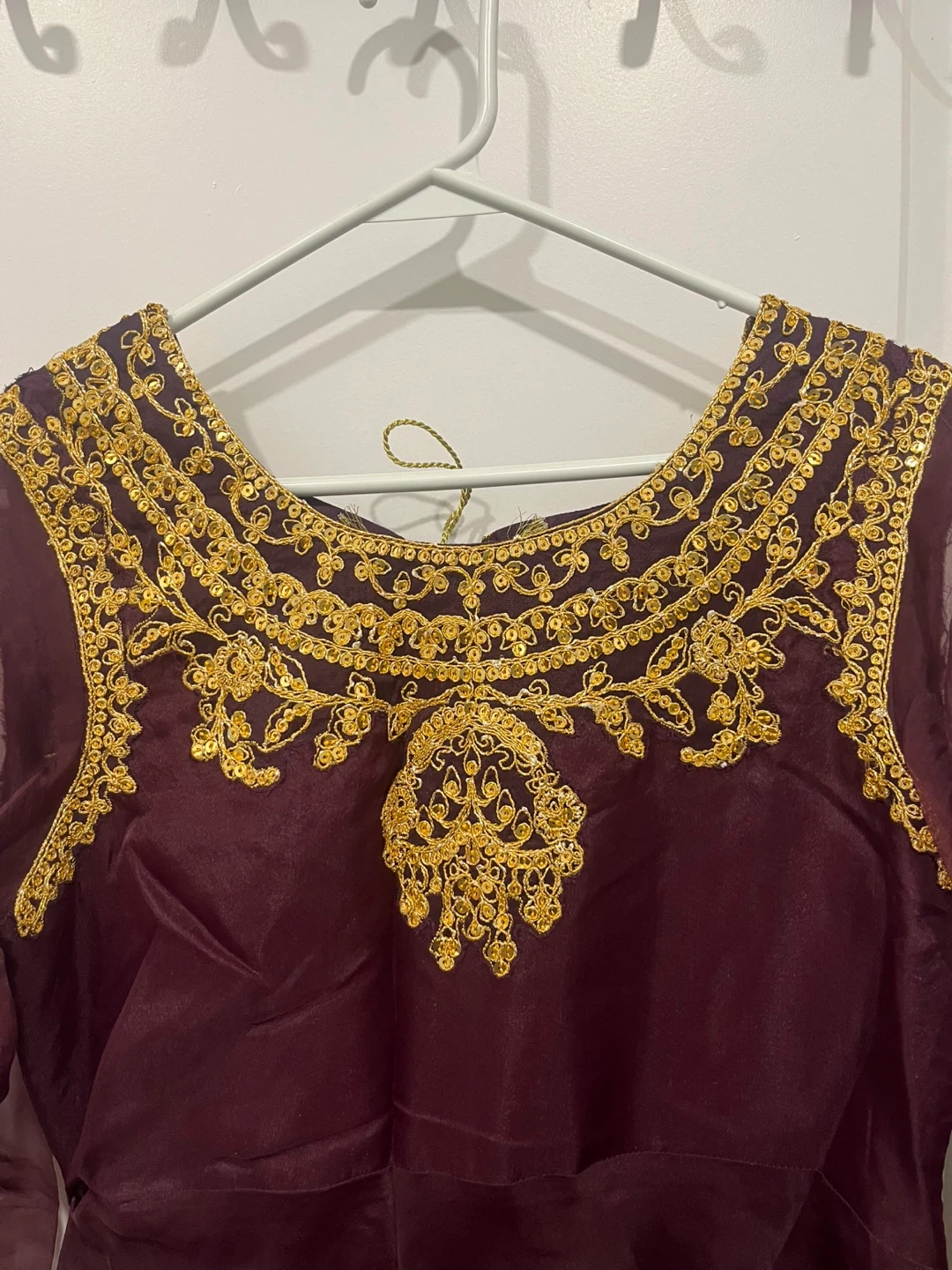 Purple Anarkali dress with intricate gold embroidery on the neckline, sleeves, and hem by Asim jofa . Sheer sleeves add an elegant touch. This dress is perfect for festive occasions and cultural events. It's designed for a flowing, comfortable fit. Fits a size small