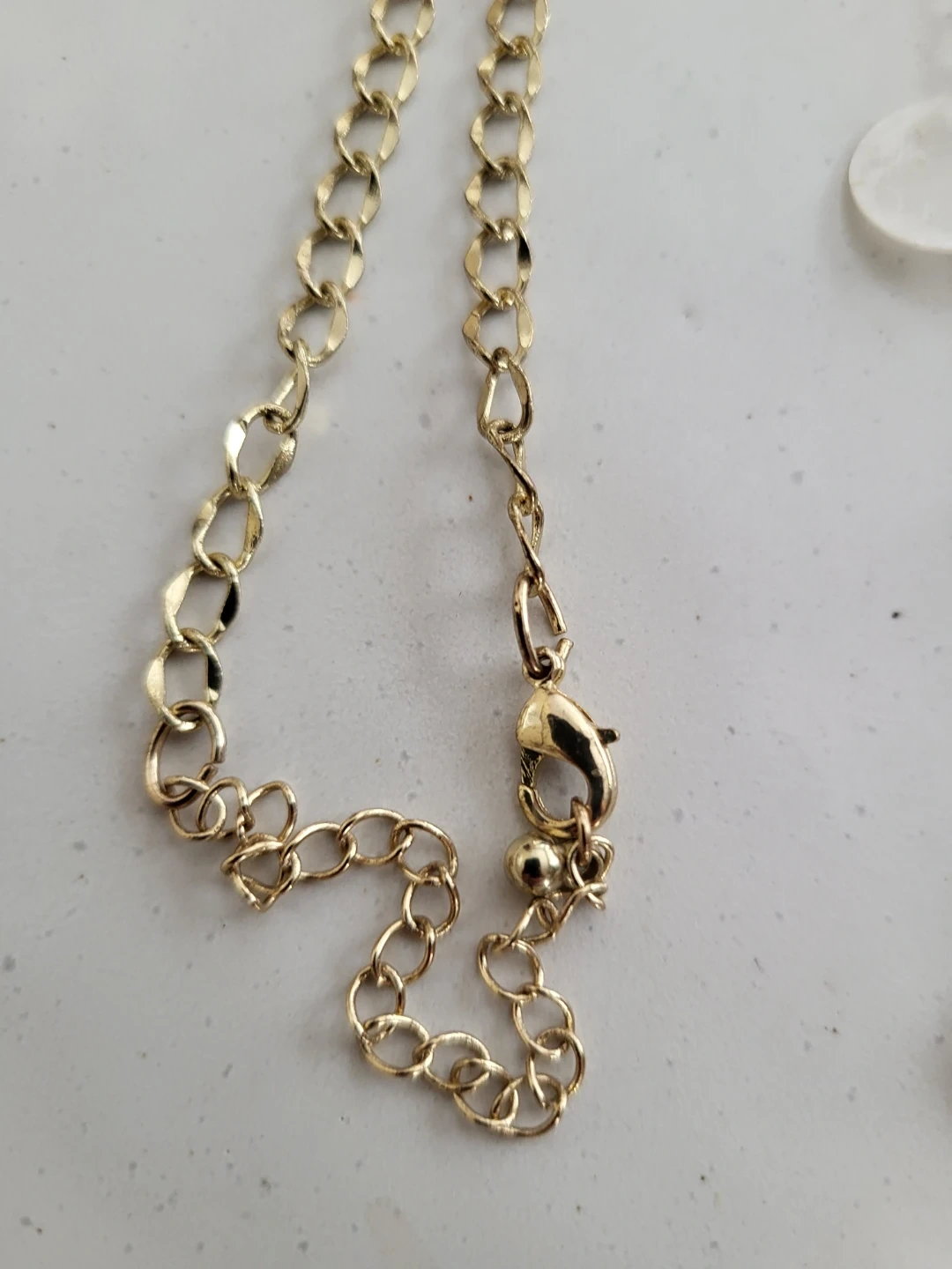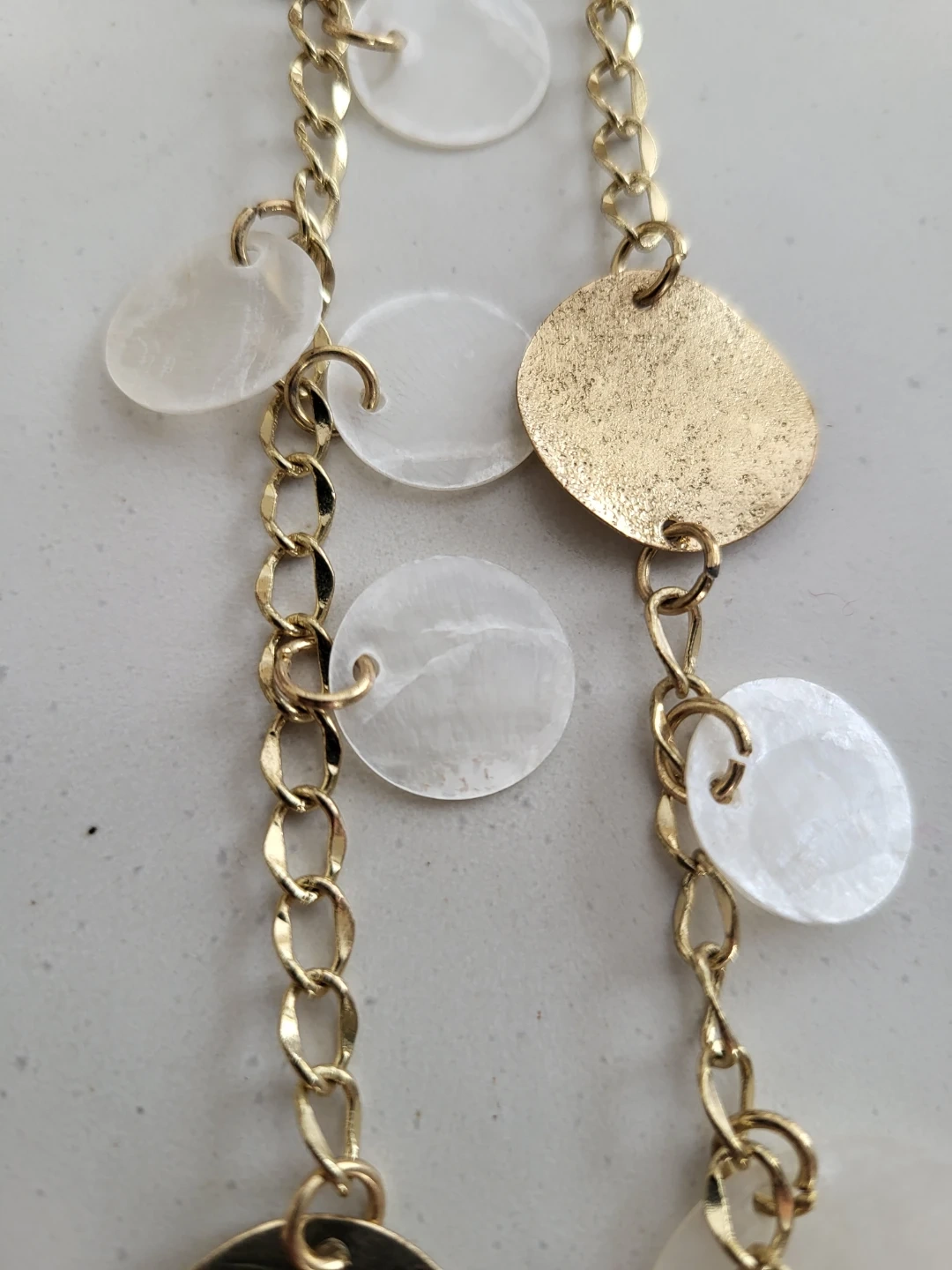 This necklace features a gold tone chain with interspersed round shell discs and textured gold tone discs. It's a lovely statement piece. The clasp is a standard lobster claw closure.