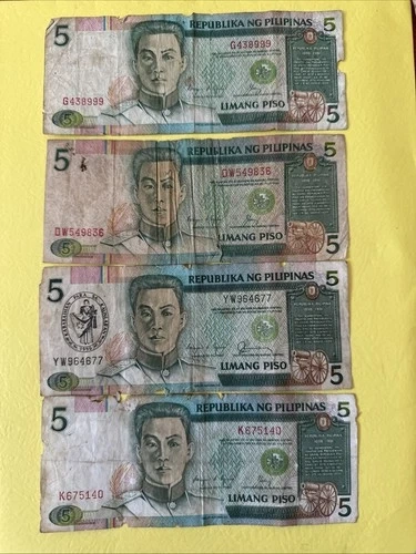 Delve into the rich tapestry of Asian currency with this set of four 5 Philippine peso bills. Originating from the vibrant archipelago of the Philippines, each bill is a testament to the country's history and craftsmanship, showcasing iconic designs that reflect the nation's culture and heritage. Ideal for collectors and enthusiasts of global paper money, this set offers a unique opportunity to own a piece of the Philippines' numismatic legacy. Add these bills to your collection and appreciate the intricate details that make them a standout representation of Asian currency.