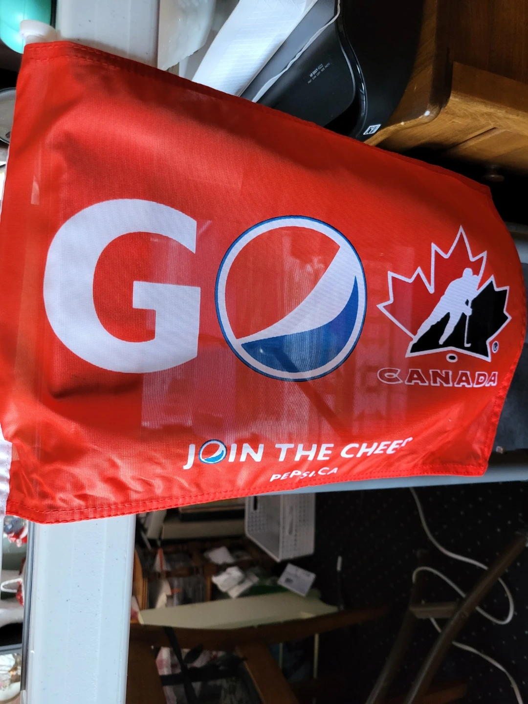 Show your team spirit with this red Pepsi Canada Car flag featuring a hockey player design. It says 'GO CANADA JOIN THE CHEER' and includes the Pepsi logo. It's made of fabric, perfect for game day or display!