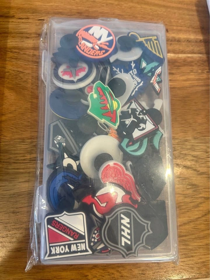 New ice hockey shoe charms. Has 30 pieces in the pack. Lots of NHL team logos and other cool hockey designs. Great for Crocs or any clogs with holes. 3 packs available. Pick up in Port Moody or UBC.