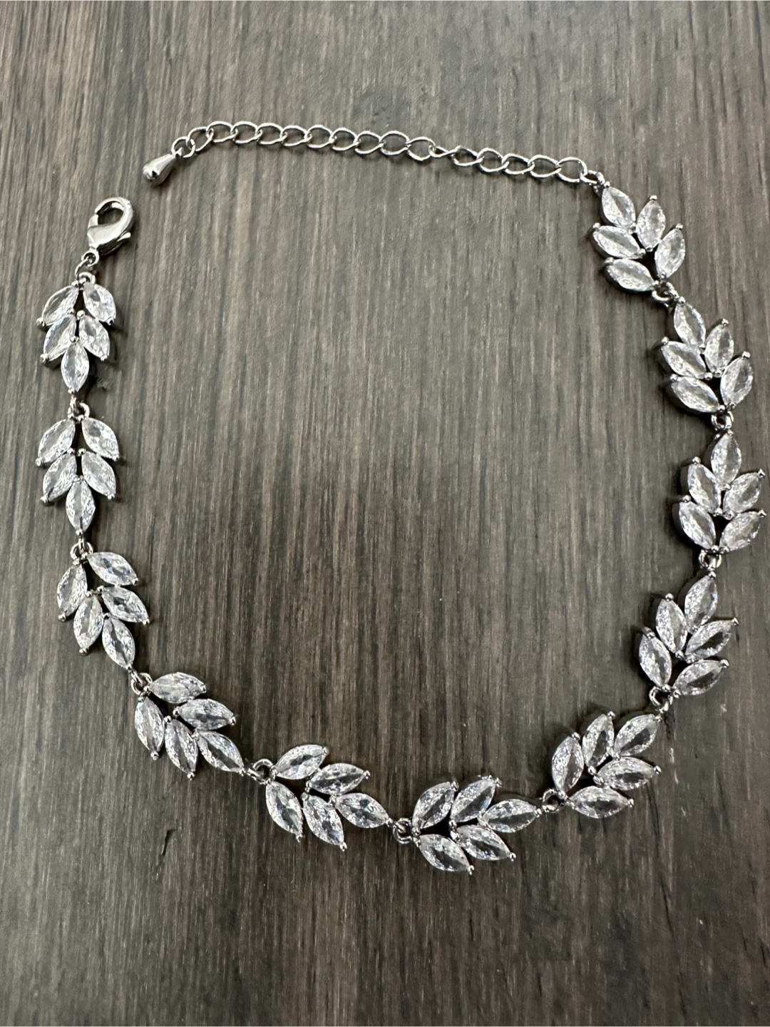 Silver-tone bracelet with clear rhinestone leaf accents. Features an adjustable chain with a lobster clasp closure.