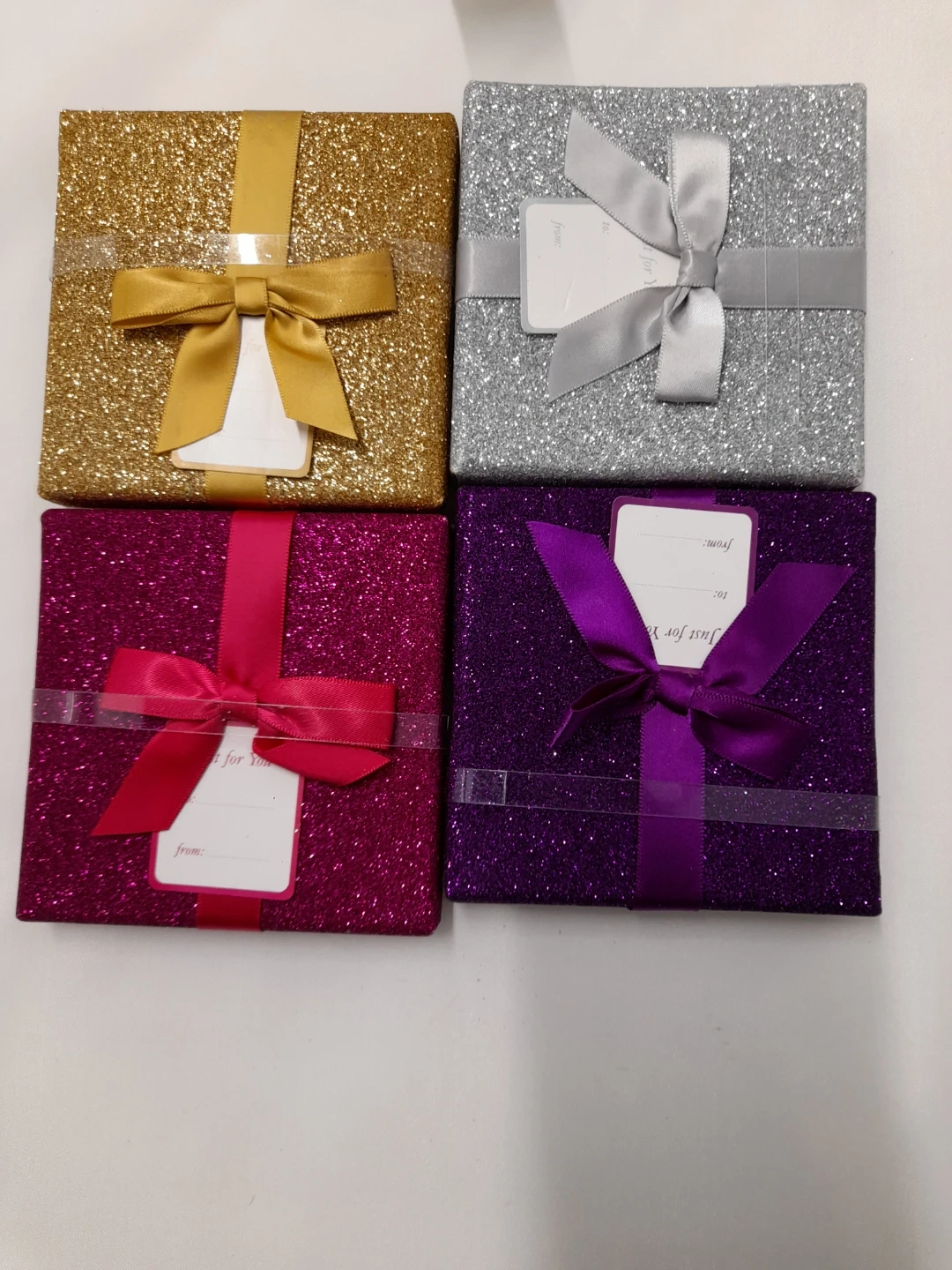 Four sparkly gift boxes in gold, silver, magenta, and purple. Each box is adorned with a satin ribbon and bow. Includes gift tags for 'From' and 'To'.