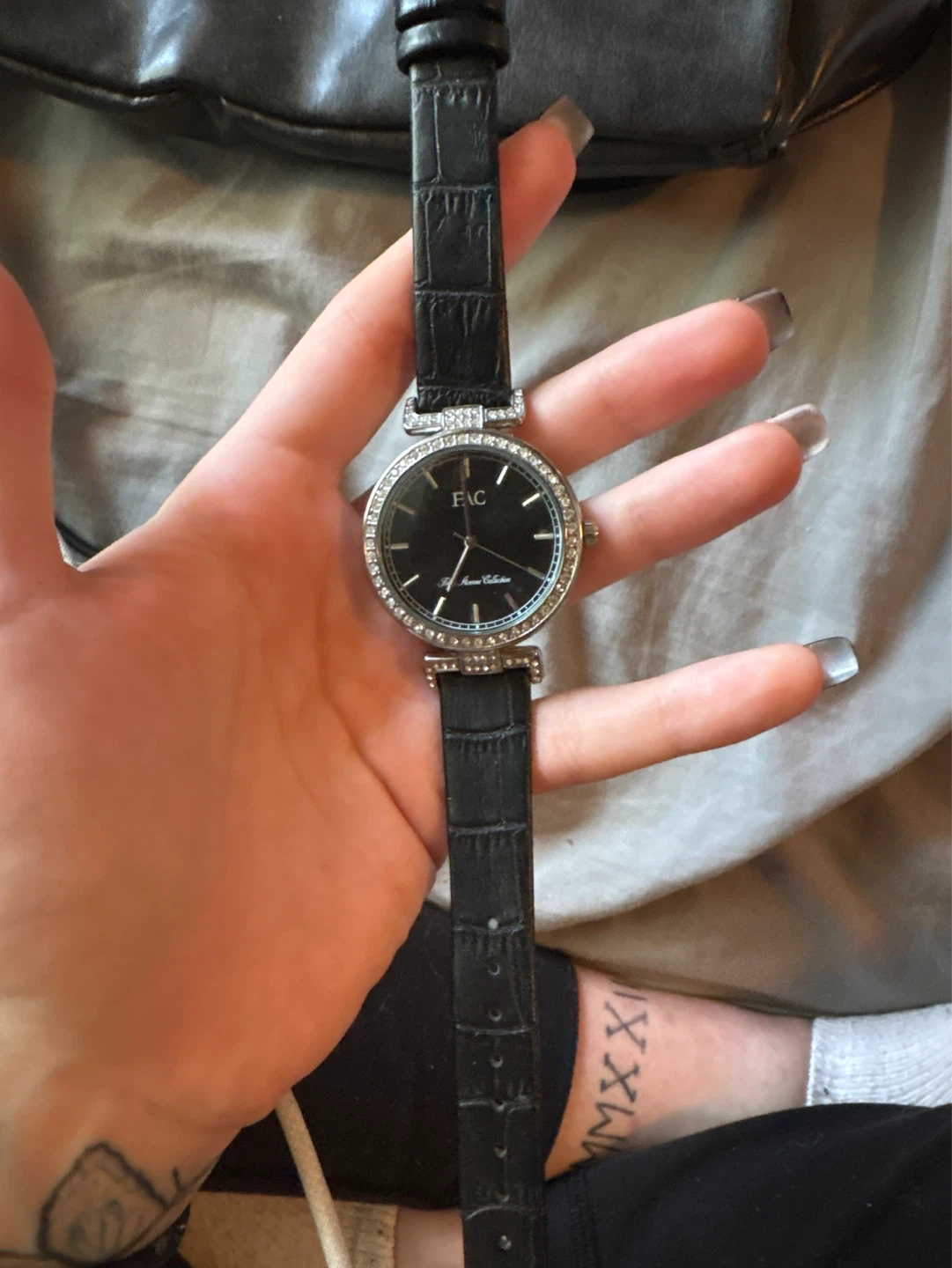 This F&C watch features a black dial with Roman numerals and a sparkling rhinestone bezel. It has a black, croc-embossed leather band. Perfect for adding a touch of elegance to any outfit!
