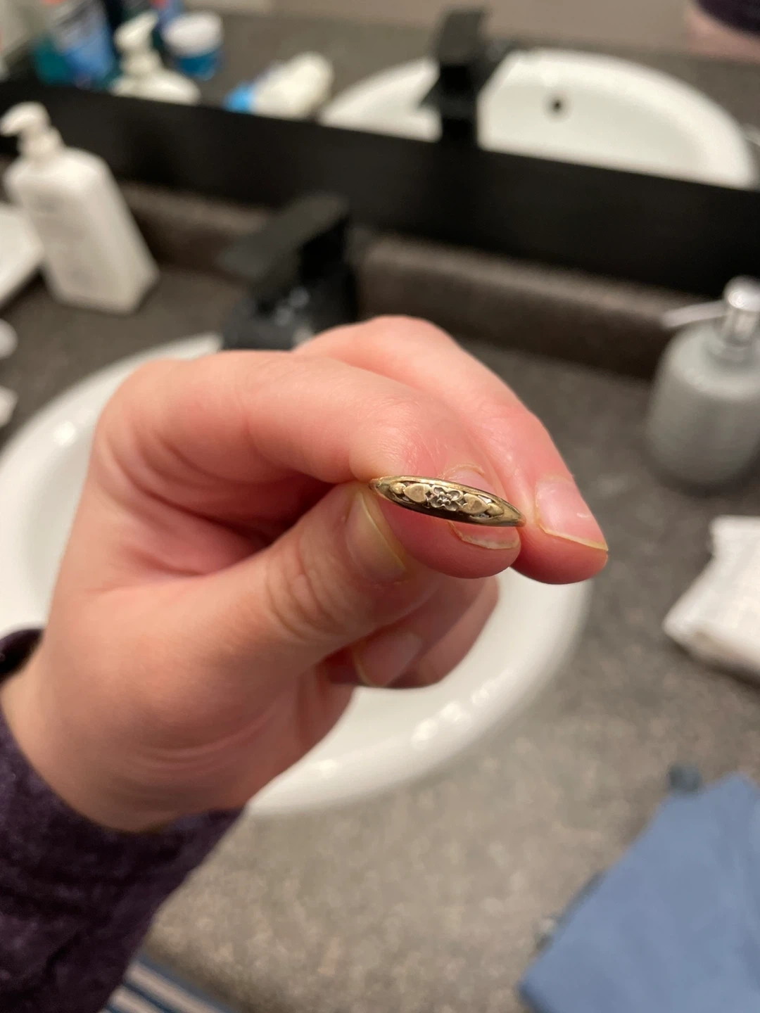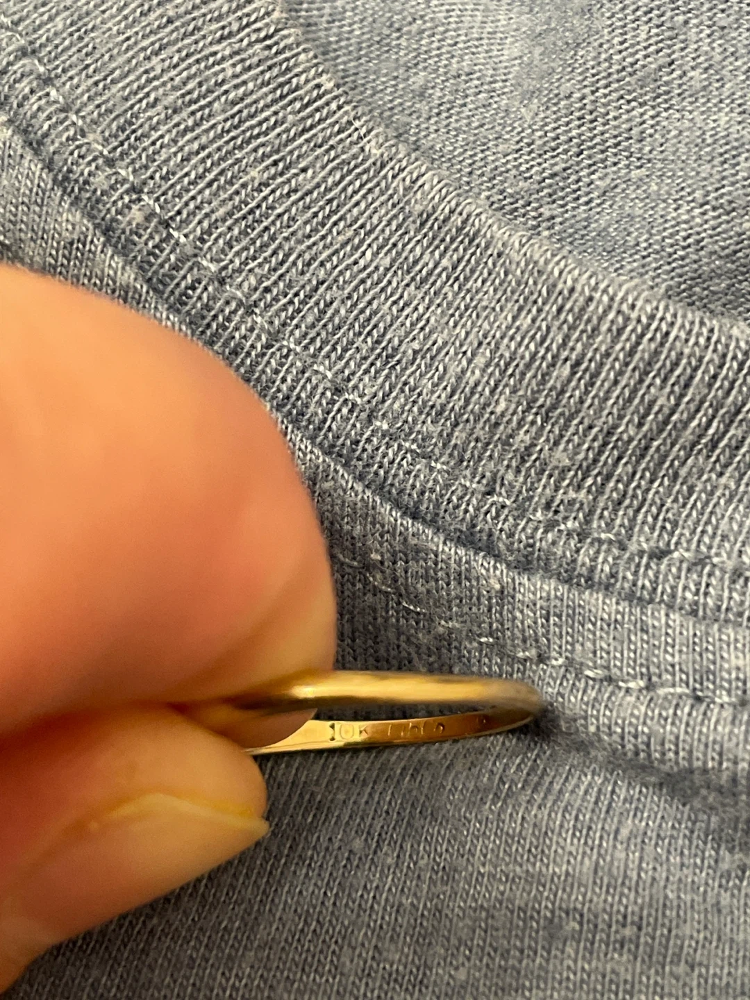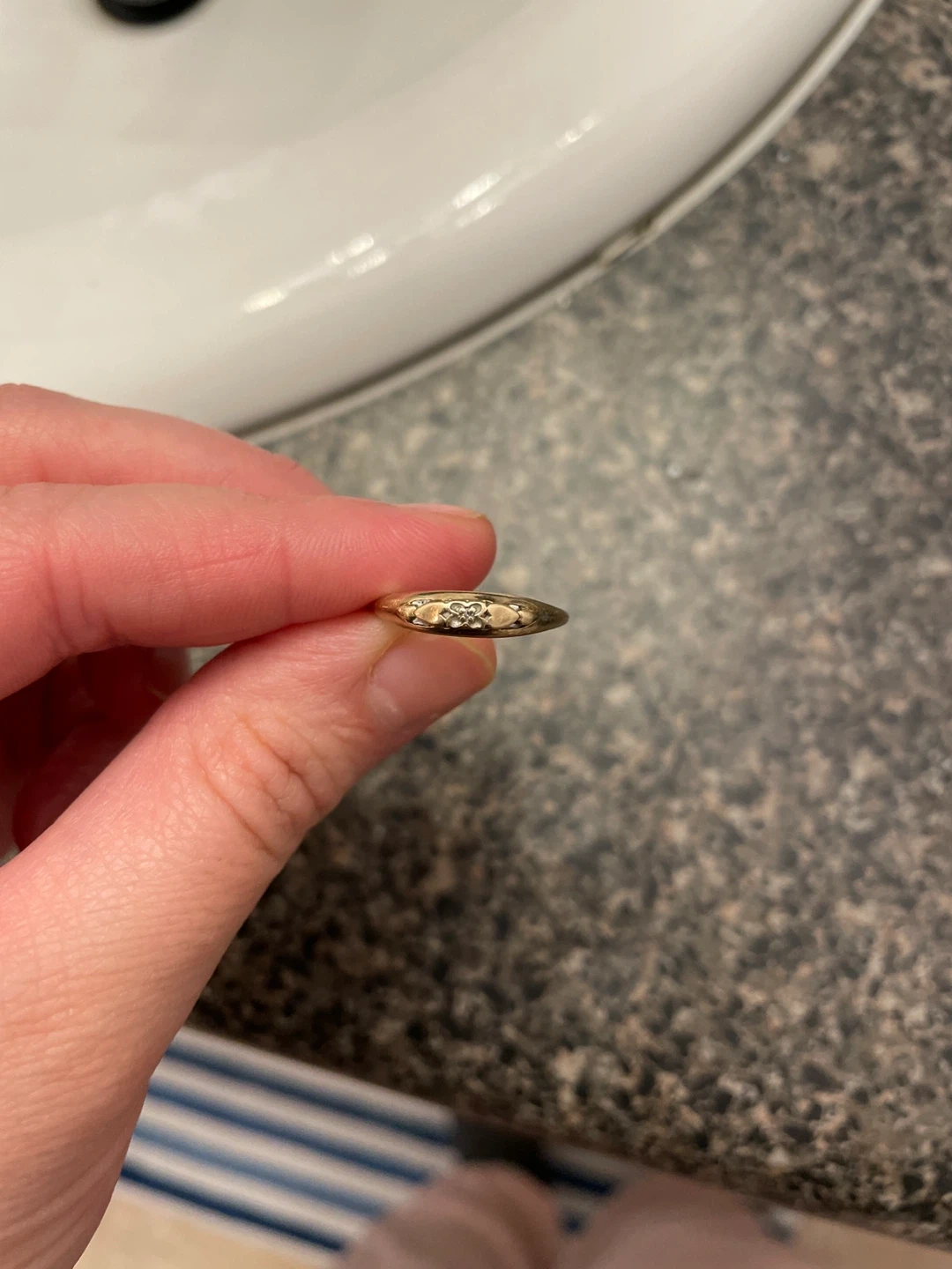 This is a 10K gold ring featuring small decorative design. It's a dainty piece with a unique etched design along the band. A lovely accessory for everyday wear!