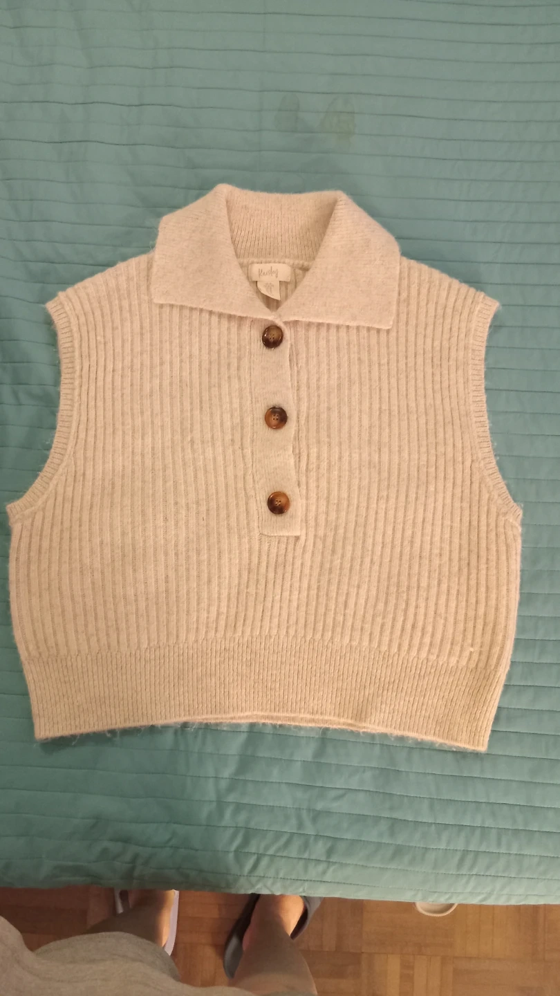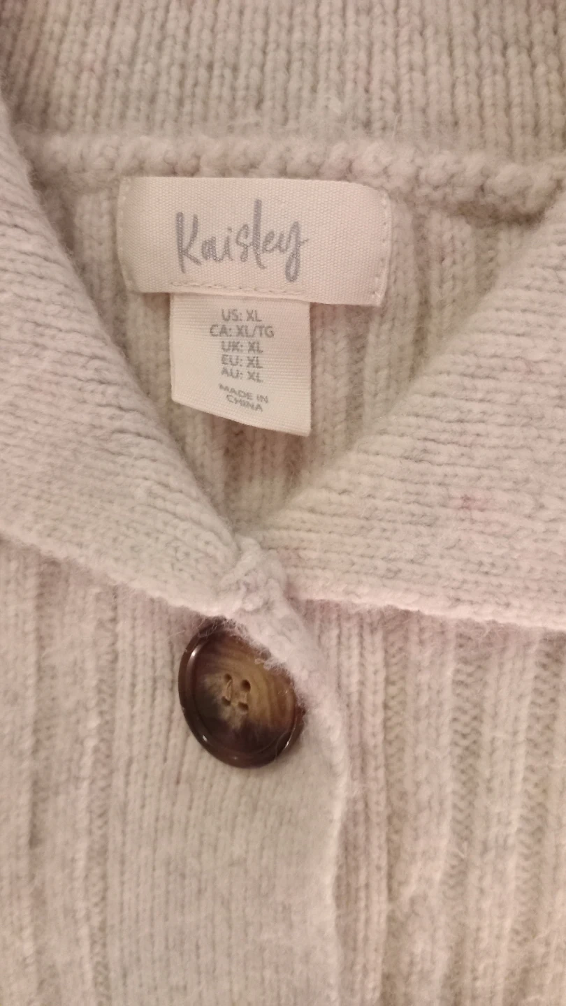 This Kaisley sweater vest is a cozy and stylish addition to your wardrobe. It features a ribbed knit texture and a collared neckline with button closures. Made in China. Size XL.
