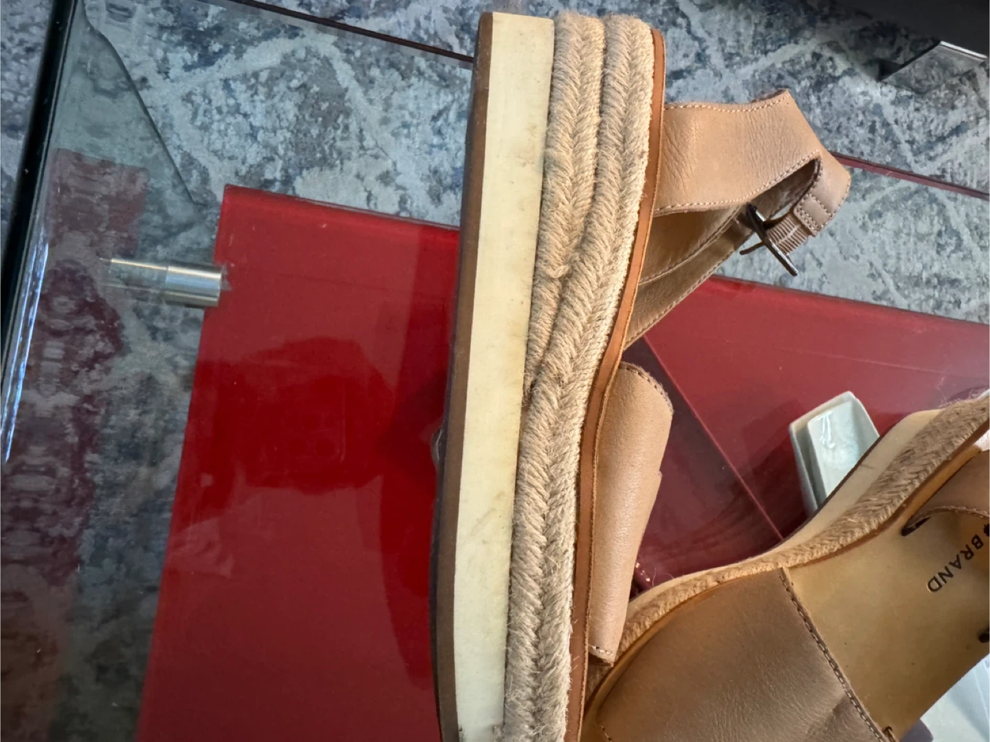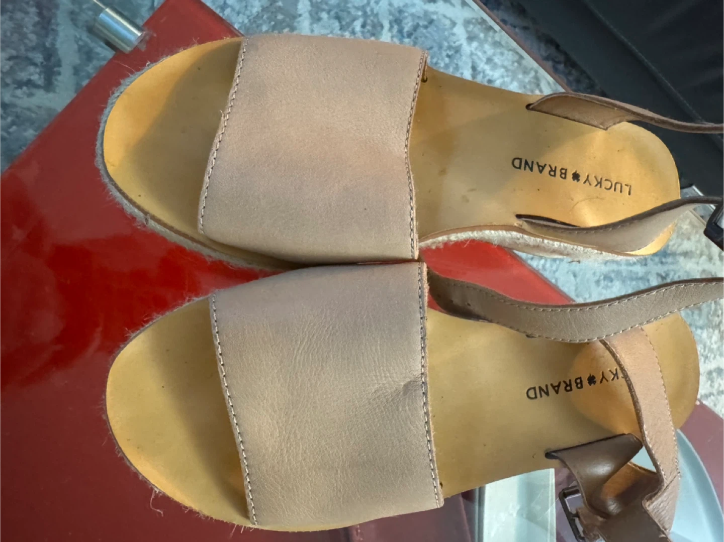 Selling a pair of Lucky Brand espadrille sandals in size 8. They're in good condition and have a cute, summery vibe with the espadrille detailing on the sole. Perfect for adding a bit of height while staying comfy!