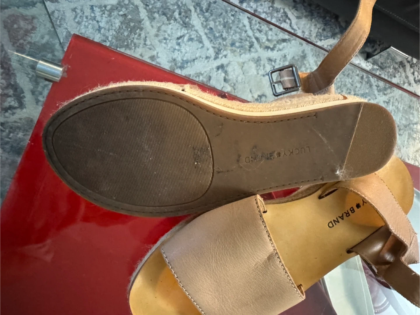 Selling a pair of Lucky Brand espadrille sandals in size 8. They're in good condition and have a cute, summery vibe with the espadrille detailing on the sole. Perfect for adding a bit of height while staying comfy!