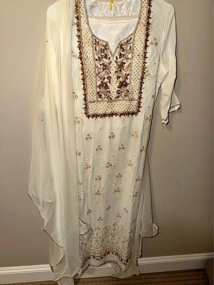 Beautiful white and gold Indian dress with intricate embroidery on the neckline, sleeves, and bottom hem. Comes with a matching sheer dupatta with gold trim. Great for parties or special events. Includes white pants. Worn only for a few hours on one occasion and has been dry cleaned and kept.