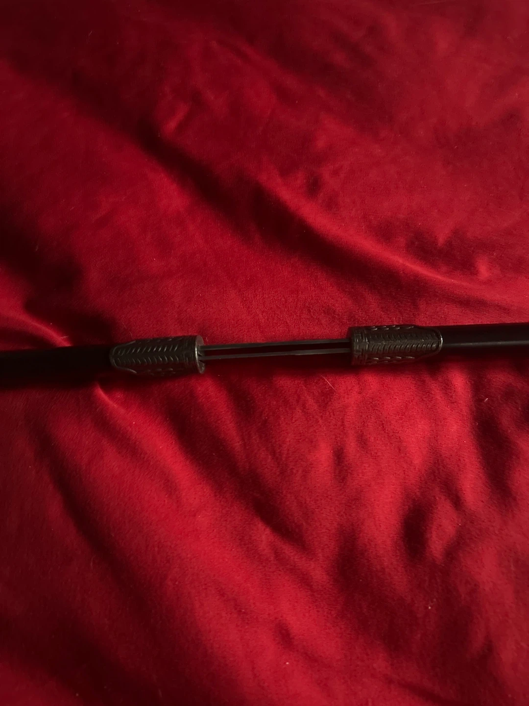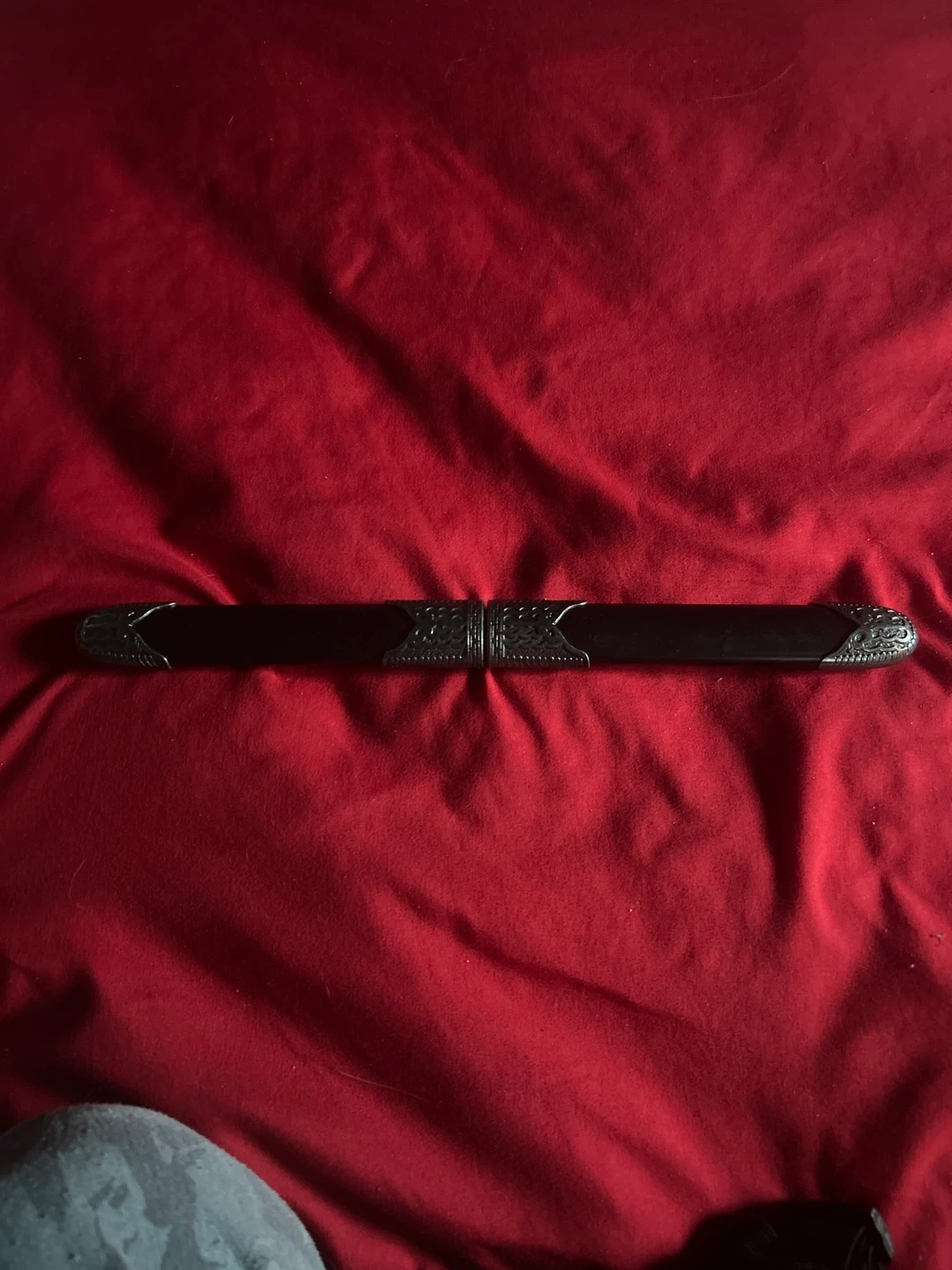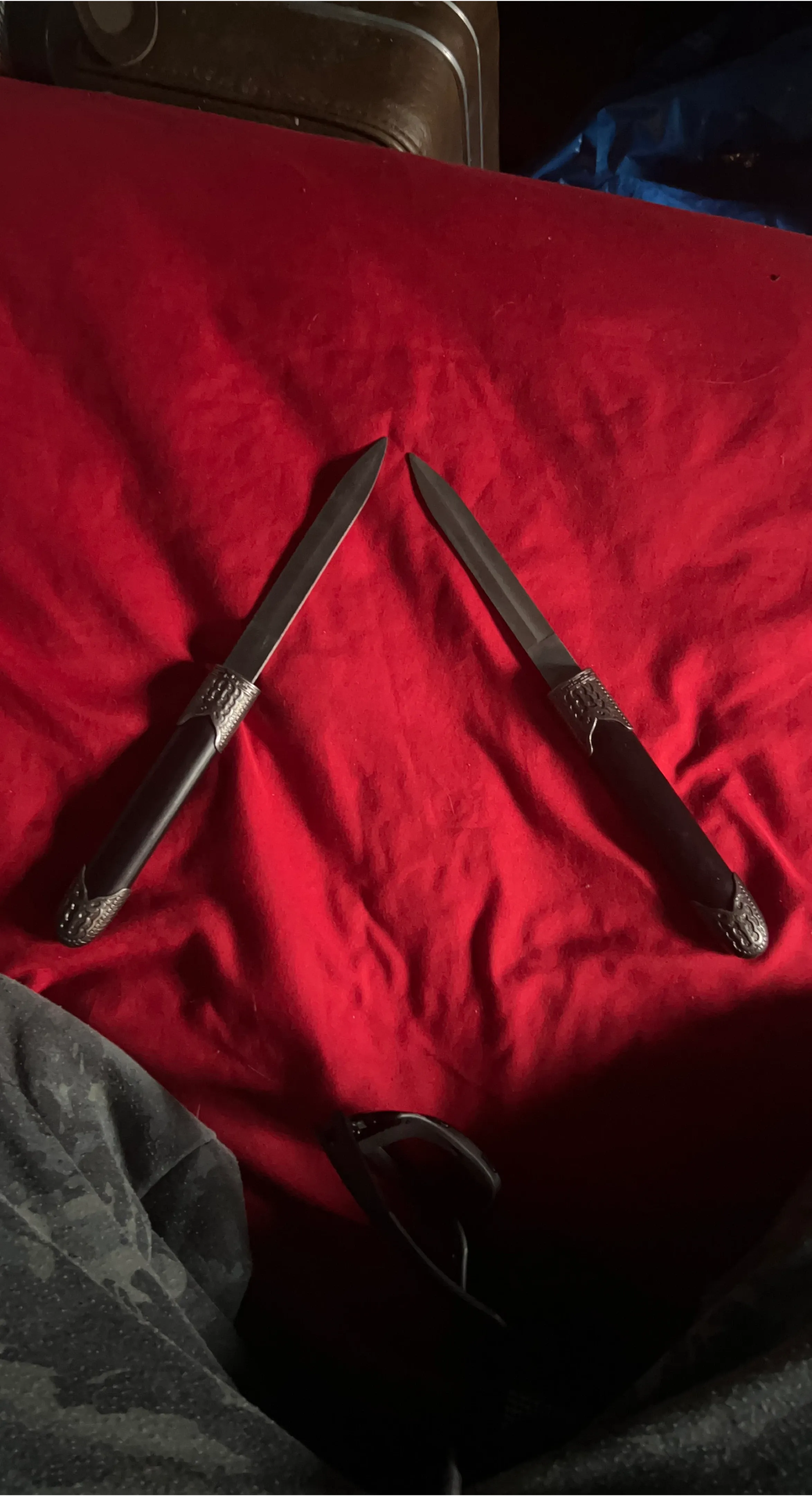 A pair of decorative daggers with ornate handles and a connecting sheath. They appear to be made of metal with dark handle grips. These are for display purposes only.