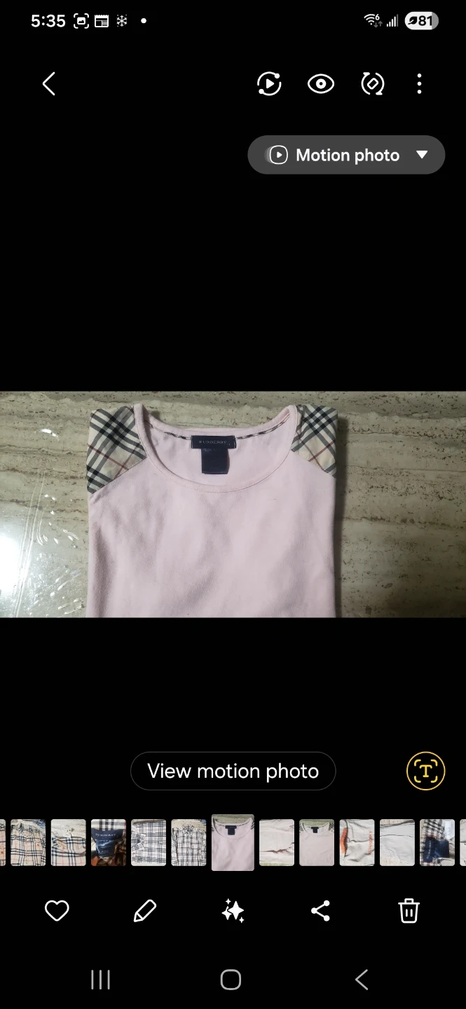 This is a pink long-sleeve t-shirt from Burberry. It features the iconic Nova Check pattern on the shoulders. The material is soft and comfortable.