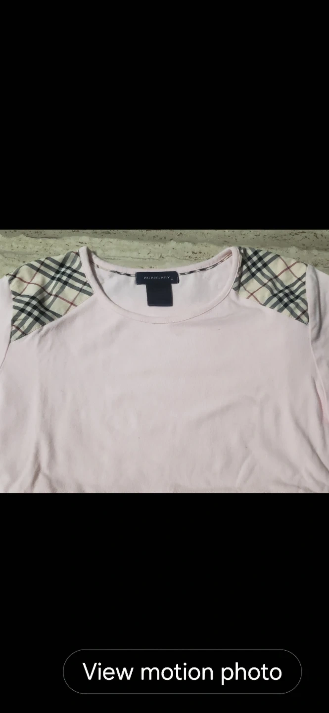 This is a pink long-sleeve t-shirt from Burberry. It features the iconic Nova Check pattern on the shoulders. The material is soft and comfortable.
