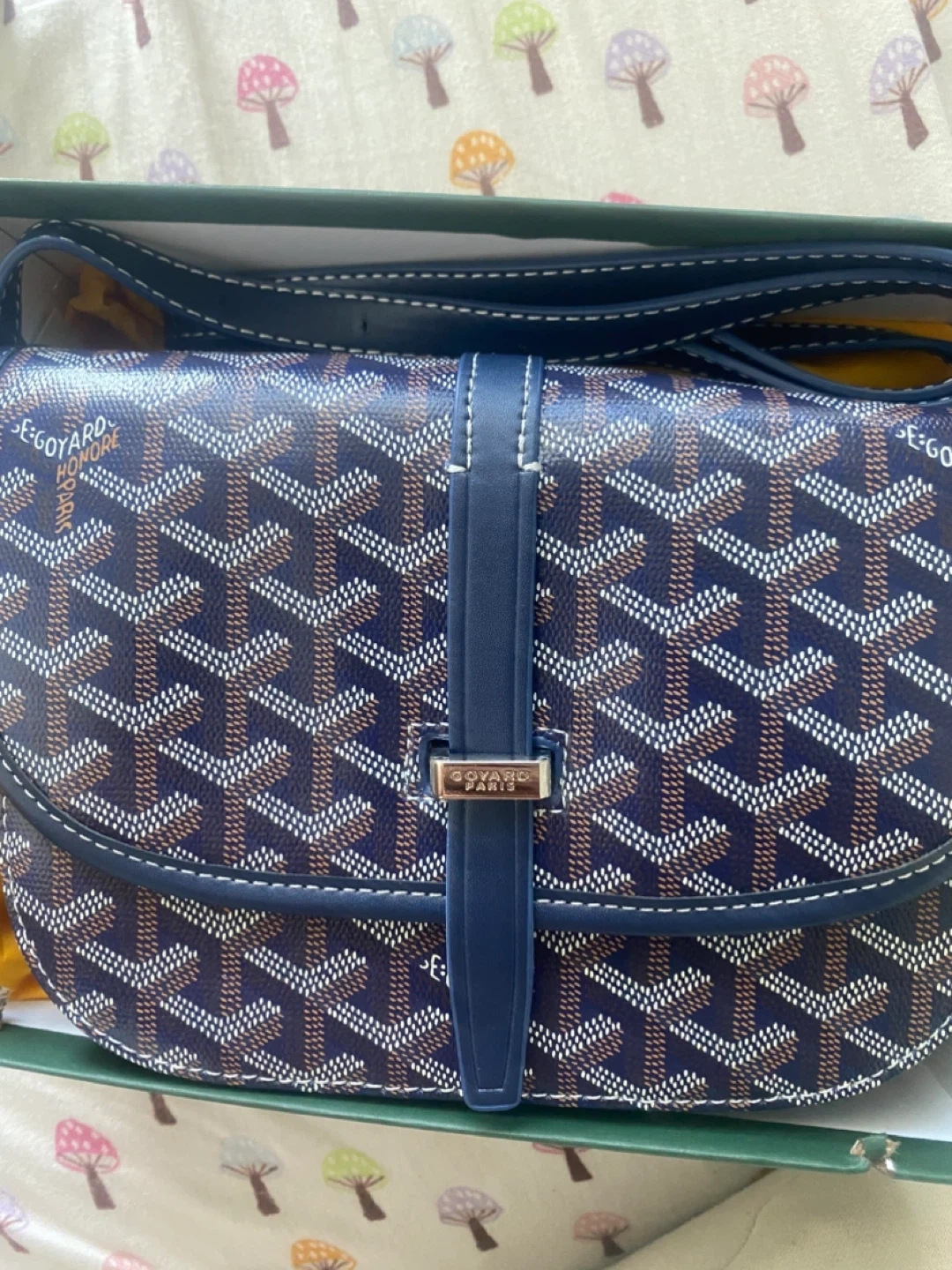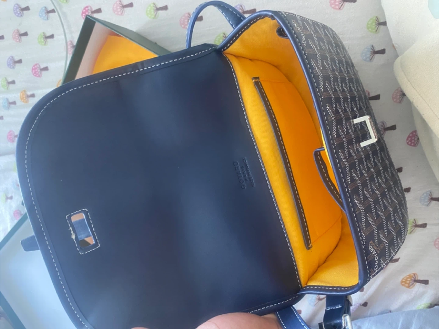This is a dark blue Goyard crossbody bag with the signature Goyardine canvas. It features a yellow interior and comes with its original box. This bag's compact size makes it handy for everyday use. NO LOW BALLERS Open to trades !