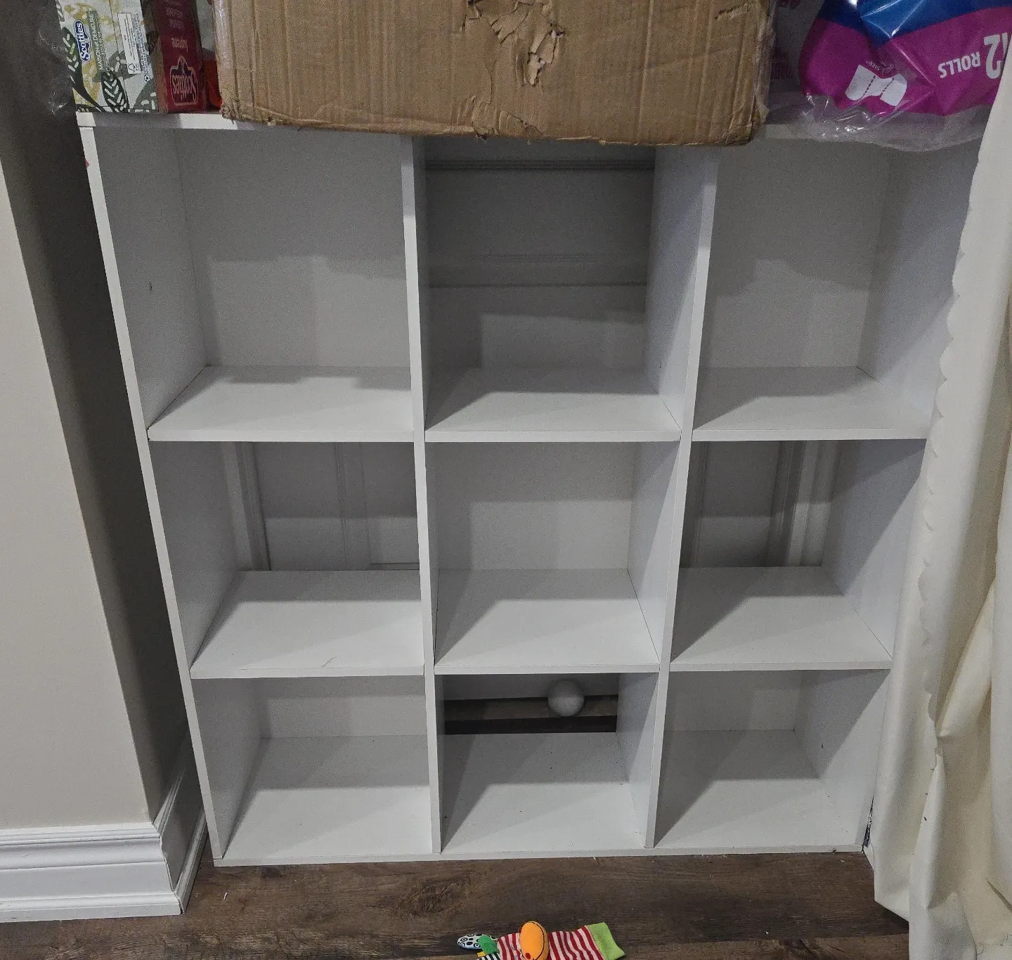 White cube shelving unit with 9 cubbies. Includes one brown fabric storage bin with handles. This unit is great for organizing books, toys, or other household items. Perfect for a kid's room or entryway!
