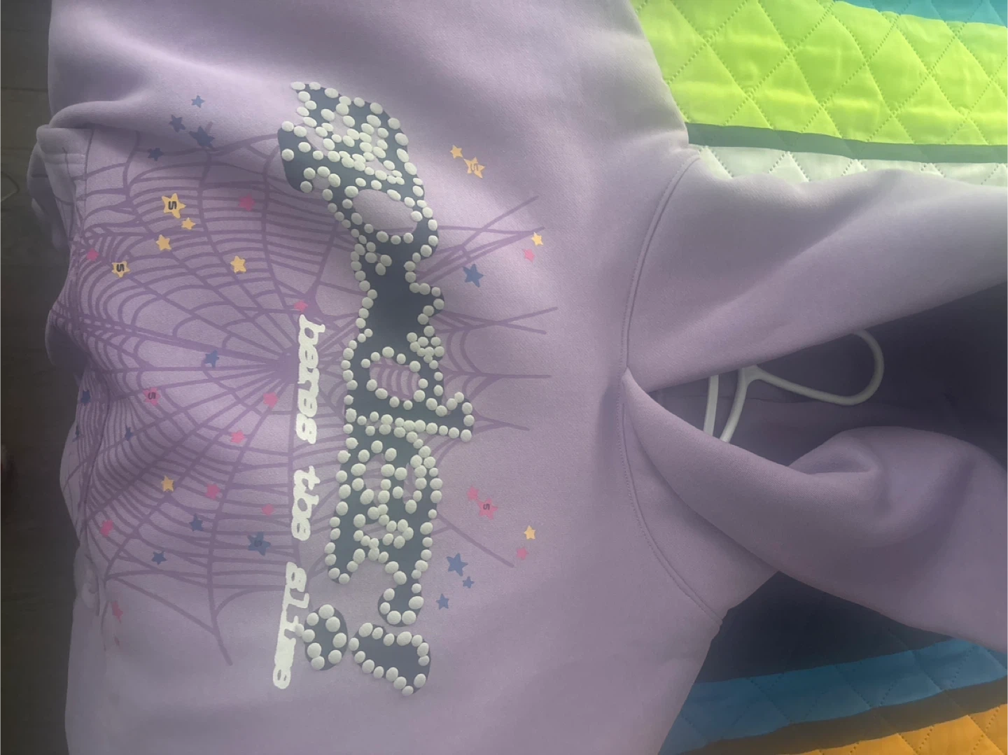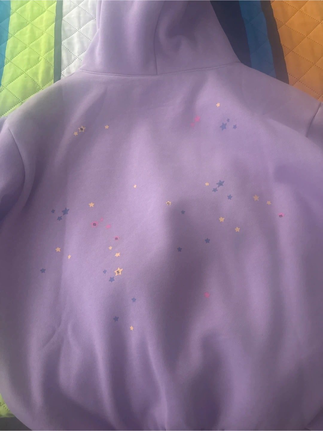 This is a lavender hoodie featuring a unique beaded design on the front with a spider web and stars. Small embroidered stars are also scattered across the back. It's a comfy and stylish piece perfect for casual wear.