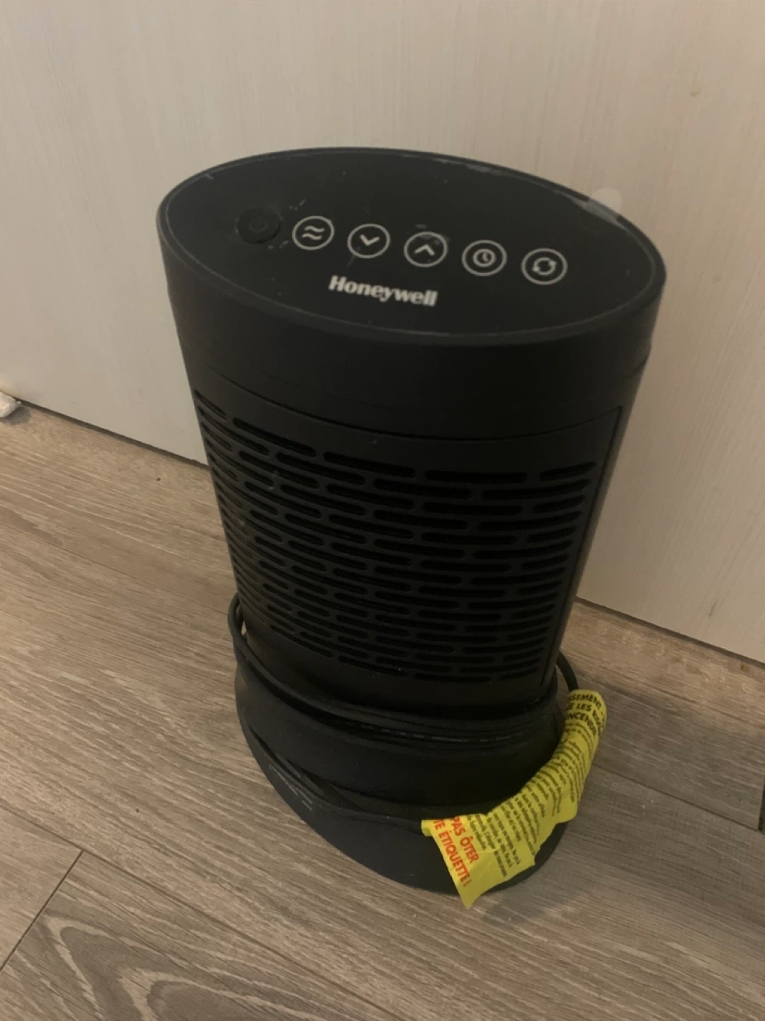This is a Honeywell portable electric heater. It's black and has multiple control settings on top. It's a compact unit perfect for personal spaces.