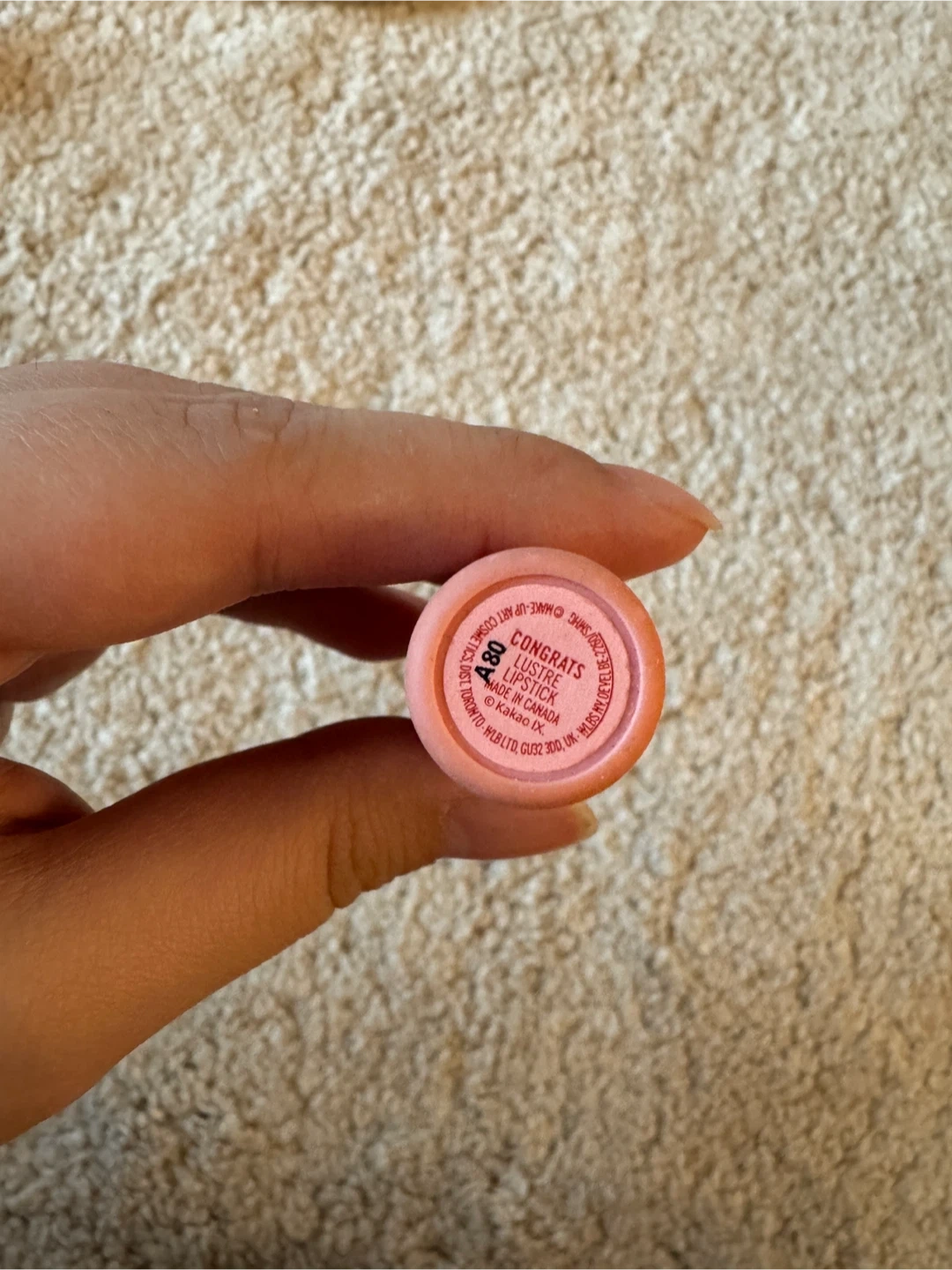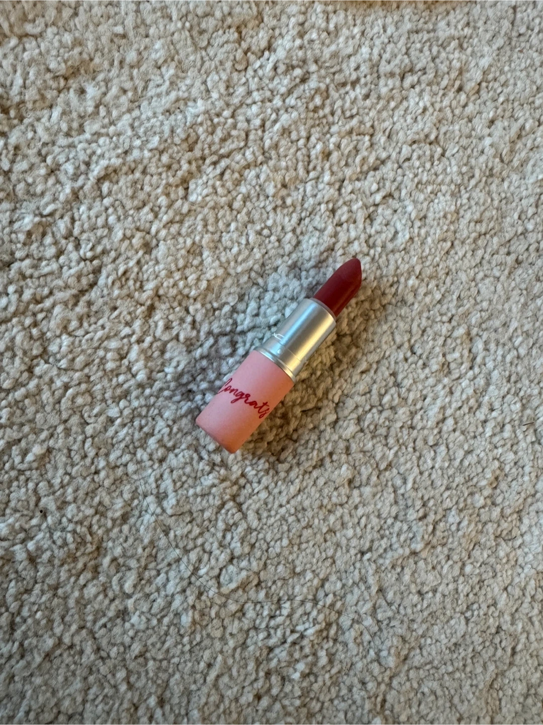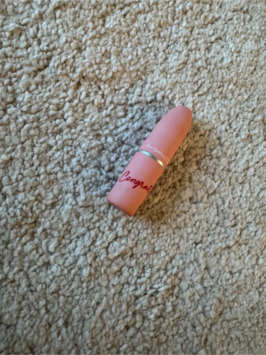 This is a MAC Congrats Lipstick in Lustre finish. It's a lipstick with a light pink casing and silver accents. The lipstick itself is a classic red shade.