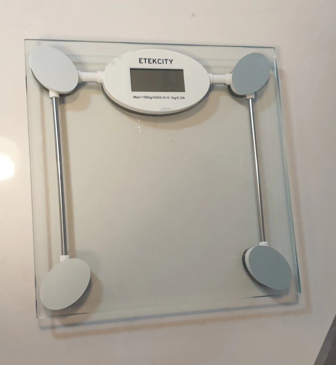 This Etekcity digital scale has a tempered glass surface and stainless steel accents. It measures up to 180kg/400lb. Great for tracking your daily weight goals!