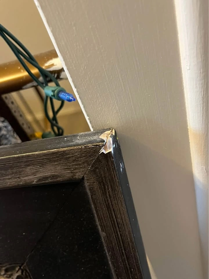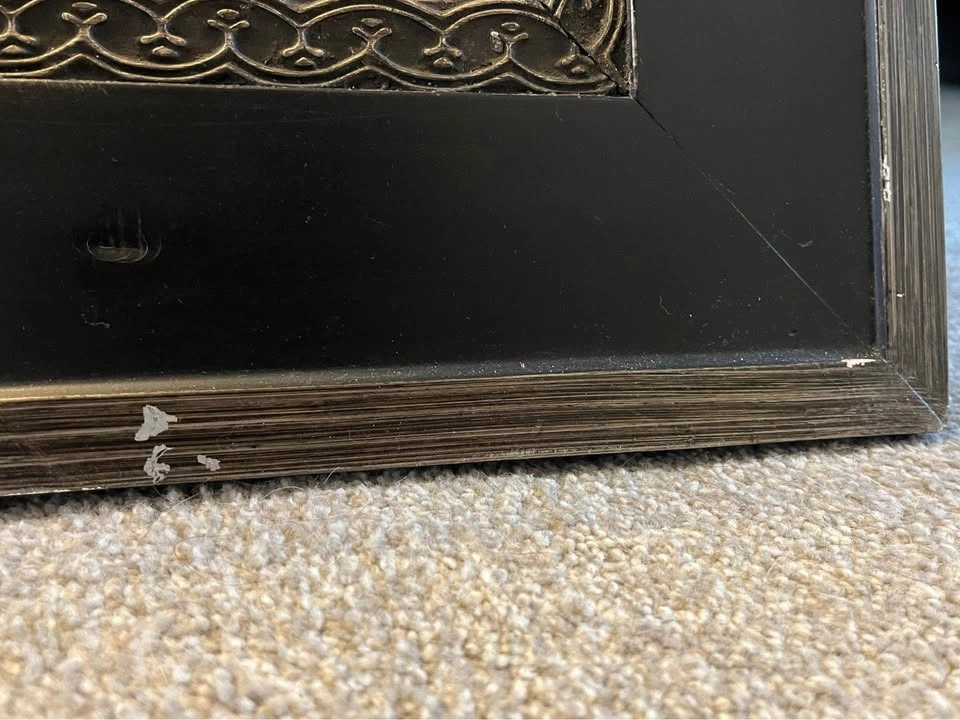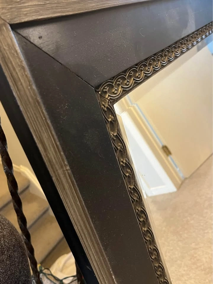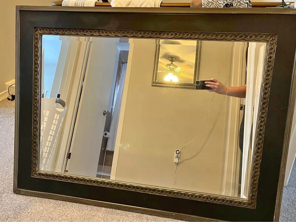 Measures 45" x 33". Can be hung vertically or horizontally (hangers included for both ways). There are some scuff marks on the frame, but it could be painted or refinished.