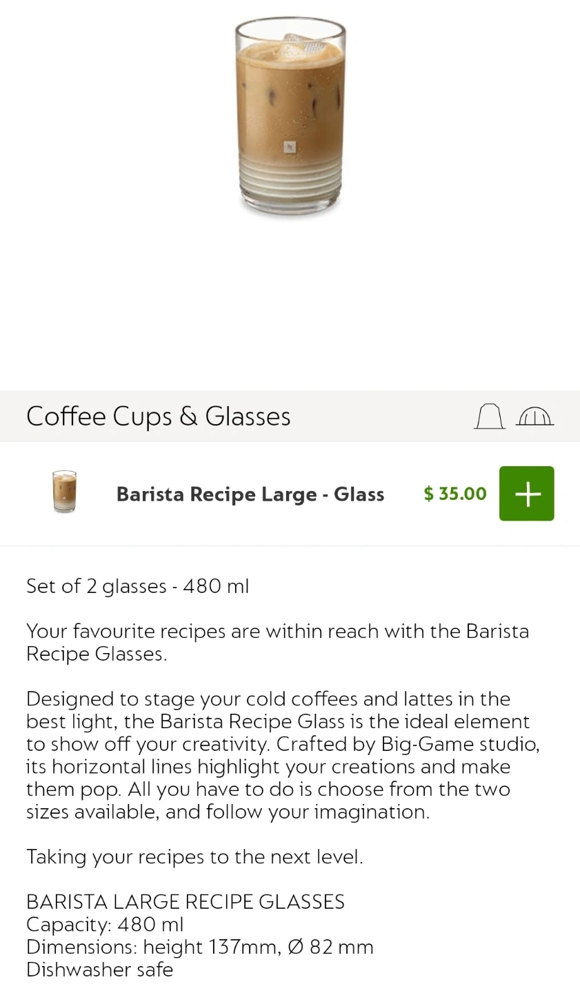 Set of 2 Nespresso Barista Recipe Large glasses, each 480 ml capacity.