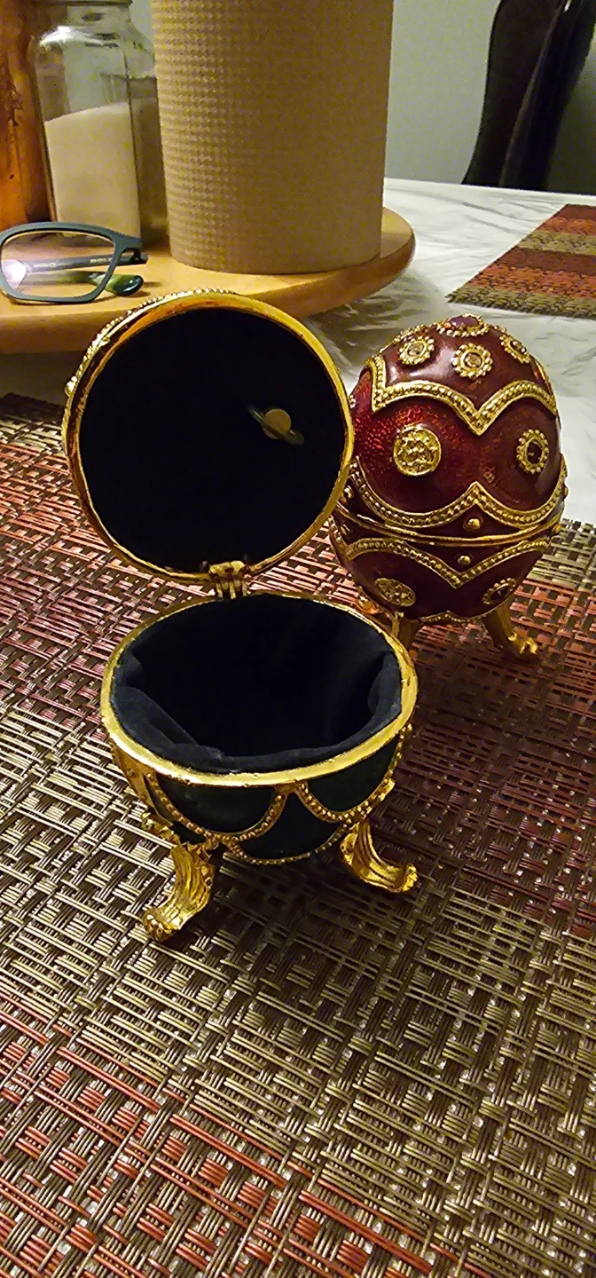 This set includes two decorative egg trinket boxes. One is green and the other is red. Each box has ornate gold detailing and sits on three gold legs. They open to reveal a velvet-lined interior, perfect for small treasures. They are also music box.