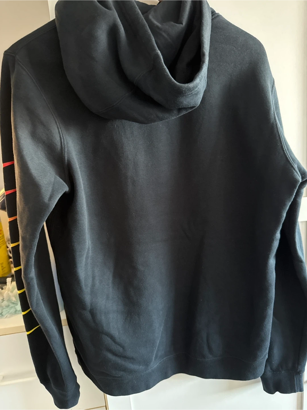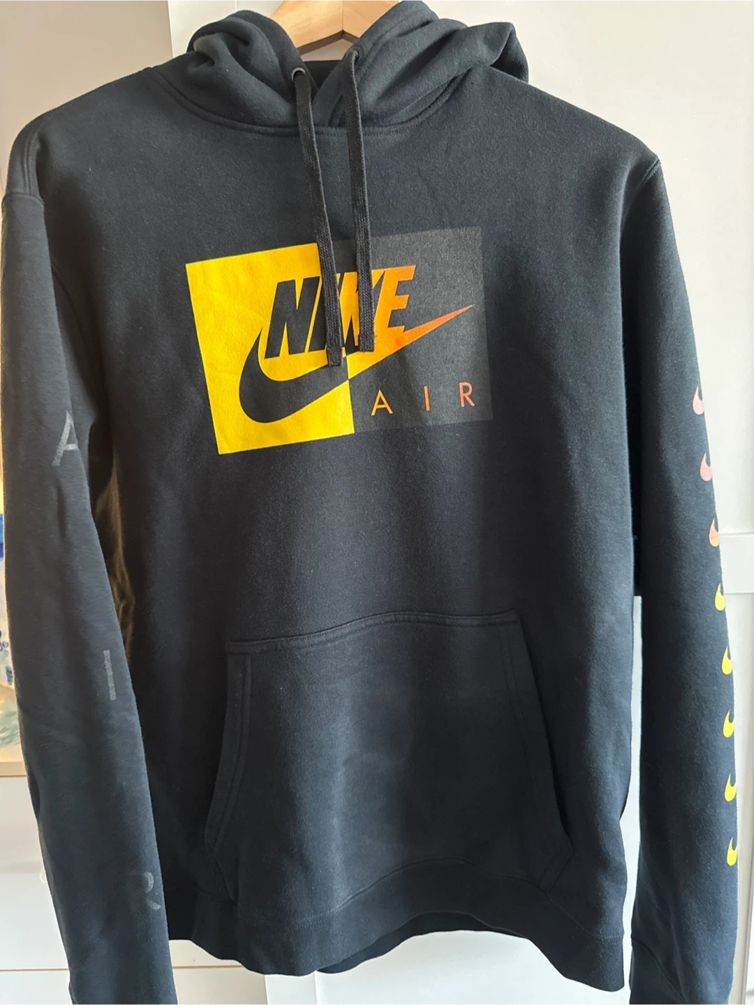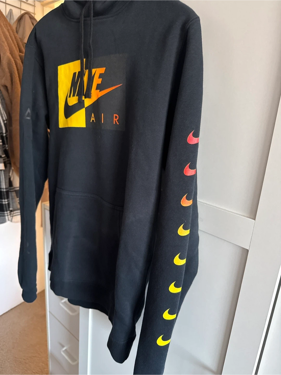 Black Nike Air hoodie with a colourful graphic on the chest and sleeves. It's a comfortable and stylish pullover with a front pocket.