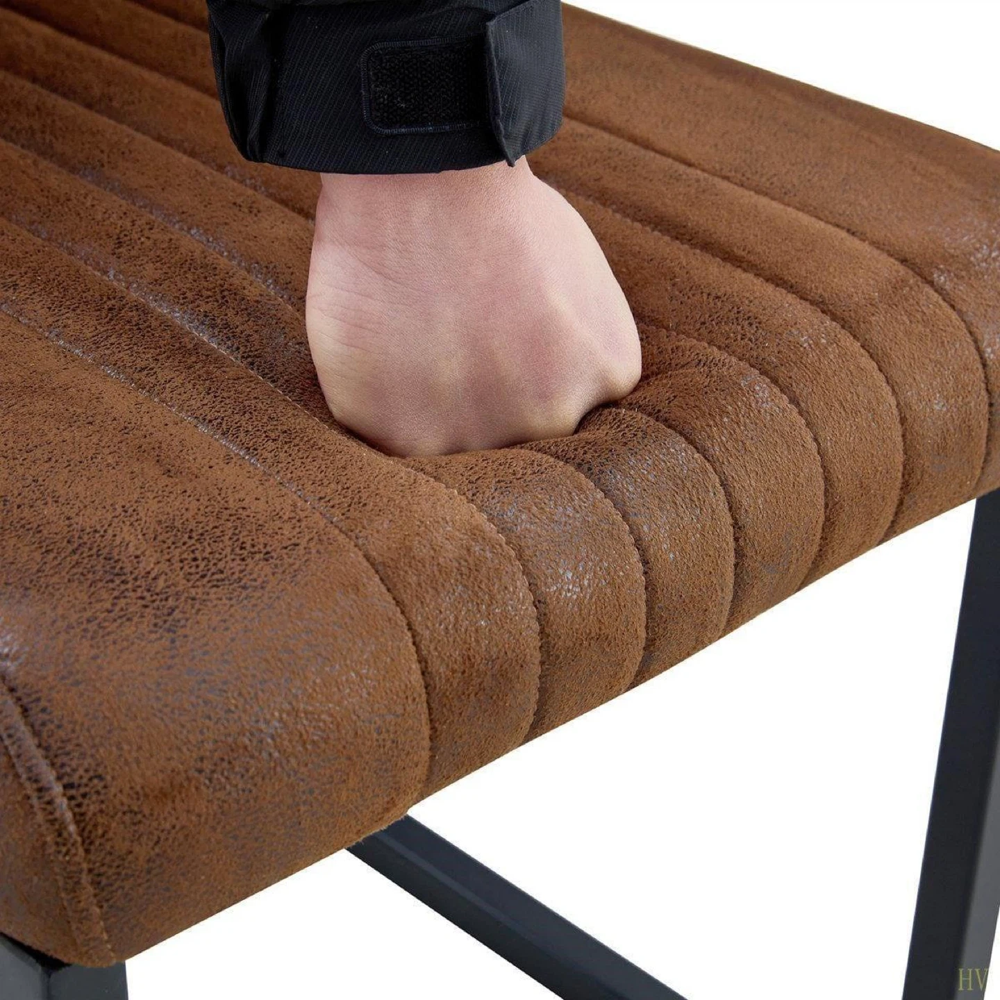 Stylish dining chair with a rich brown faux leather seat and back. Features a durable black metal frame and ribbed upholstery for added comfort. Seat is 17.5" wide and 16.5" deep. Overall dimensions are 17" W x 35" H x 19.4" D. Perfect for your dining room!