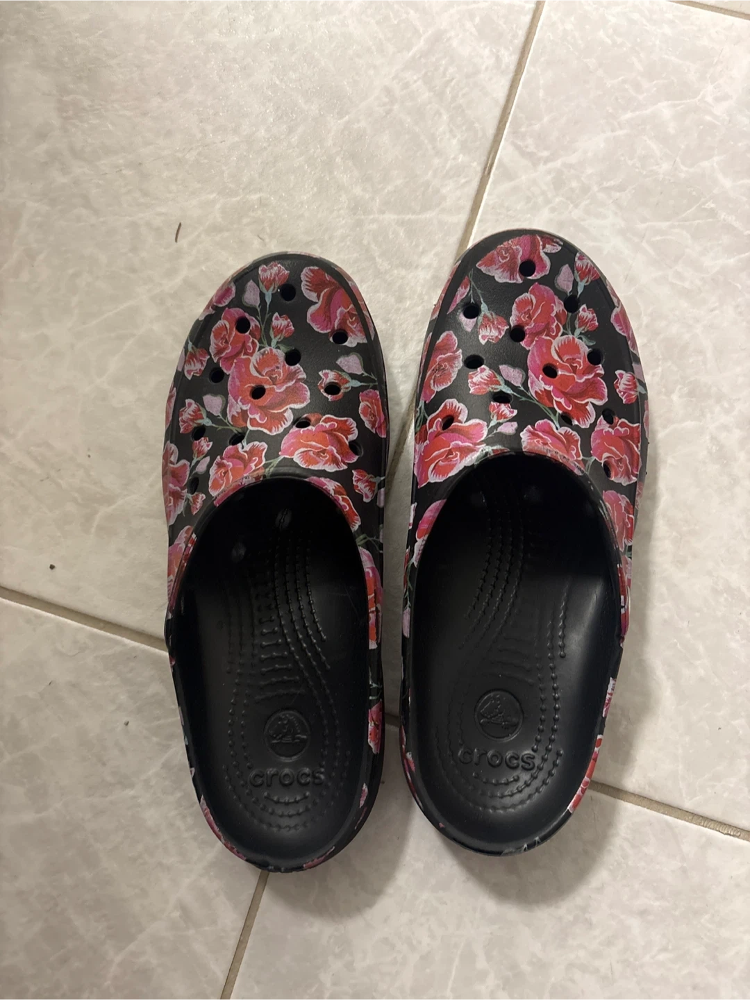 These Crocs Classic Clogs feature a black base with a vibrant floral print. They're comfortable and easy to slip on. These clogs are perfect for casual wear or gardening! Pick up cash only
