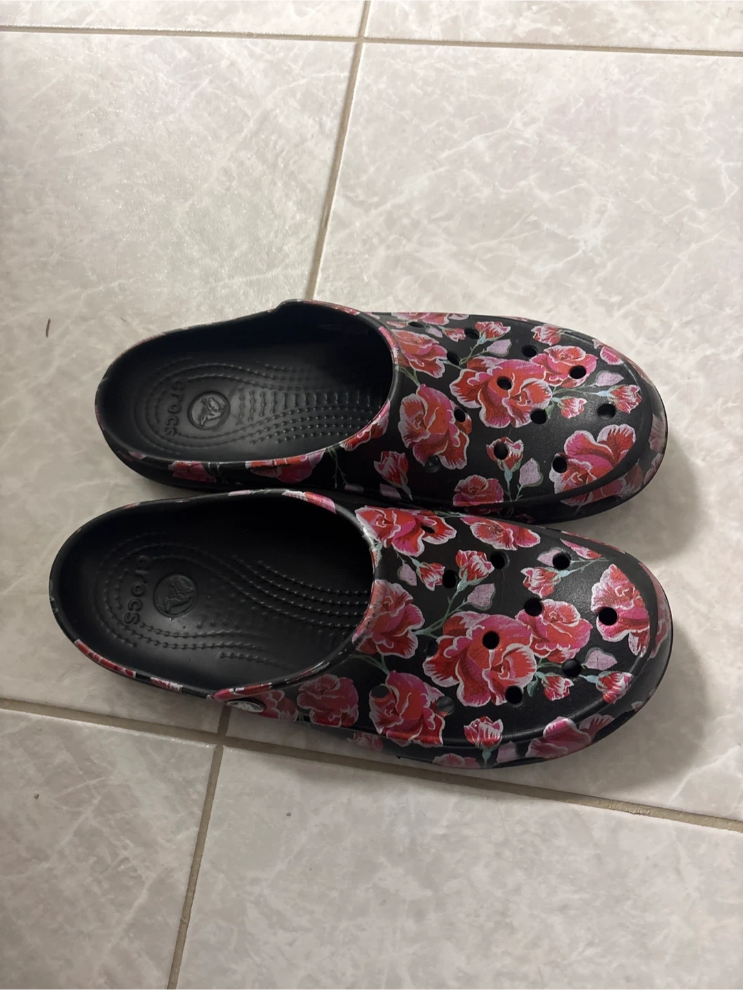 These Crocs Classic Clogs feature a black base with a vibrant floral print. They're comfortable and easy to slip on. These clogs are perfect for casual wear or gardening! Pick up cash only