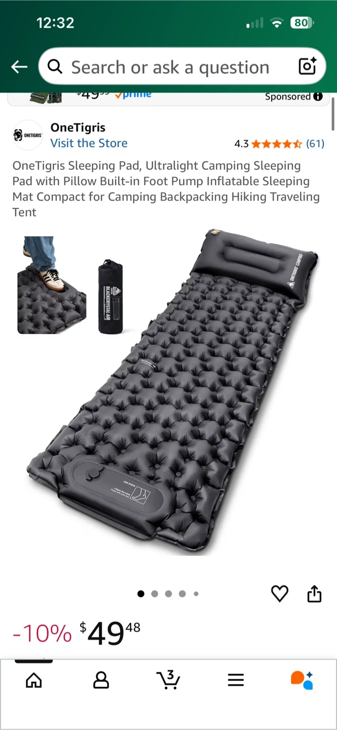 Selling a brand new OneTigris BlackCrystal Air inflatable mattress! It's lightweight and compact for camping, backpacking, hiking, and travelling. The setup size is 196 x 60 x 13.5cm and the weight is 0.75kg