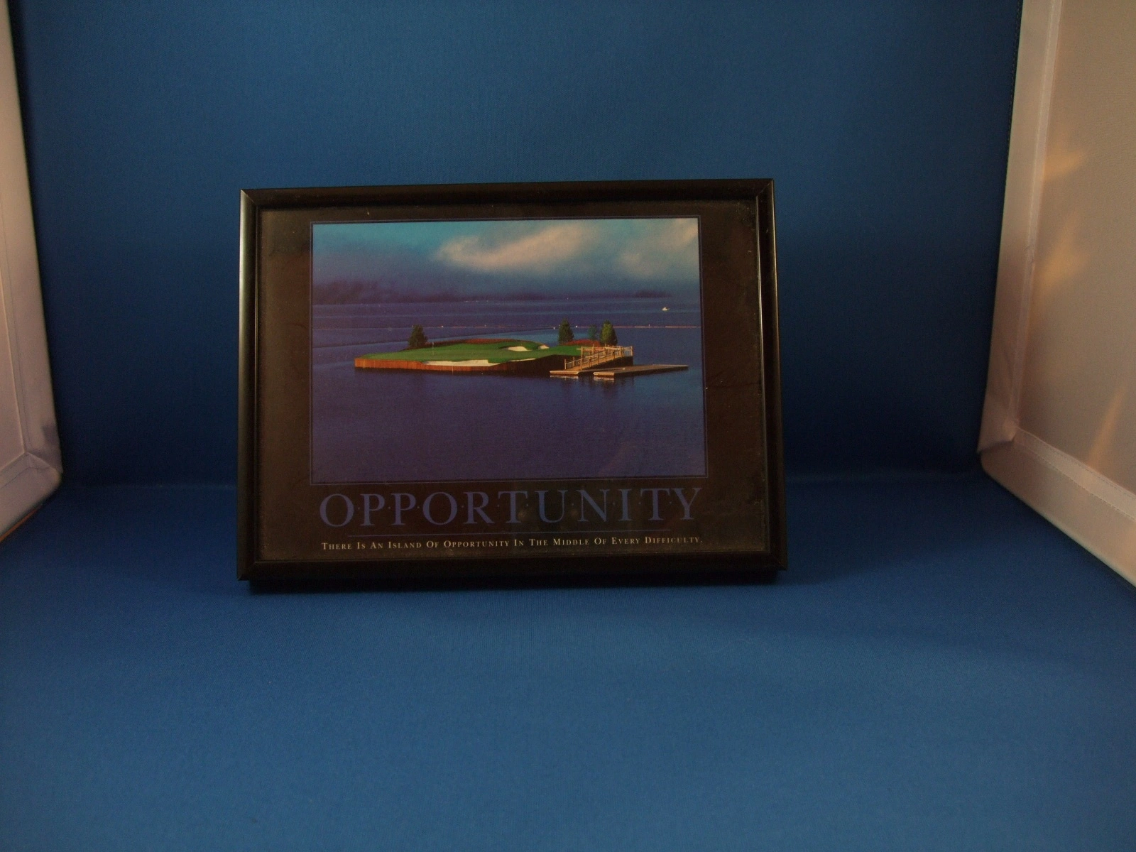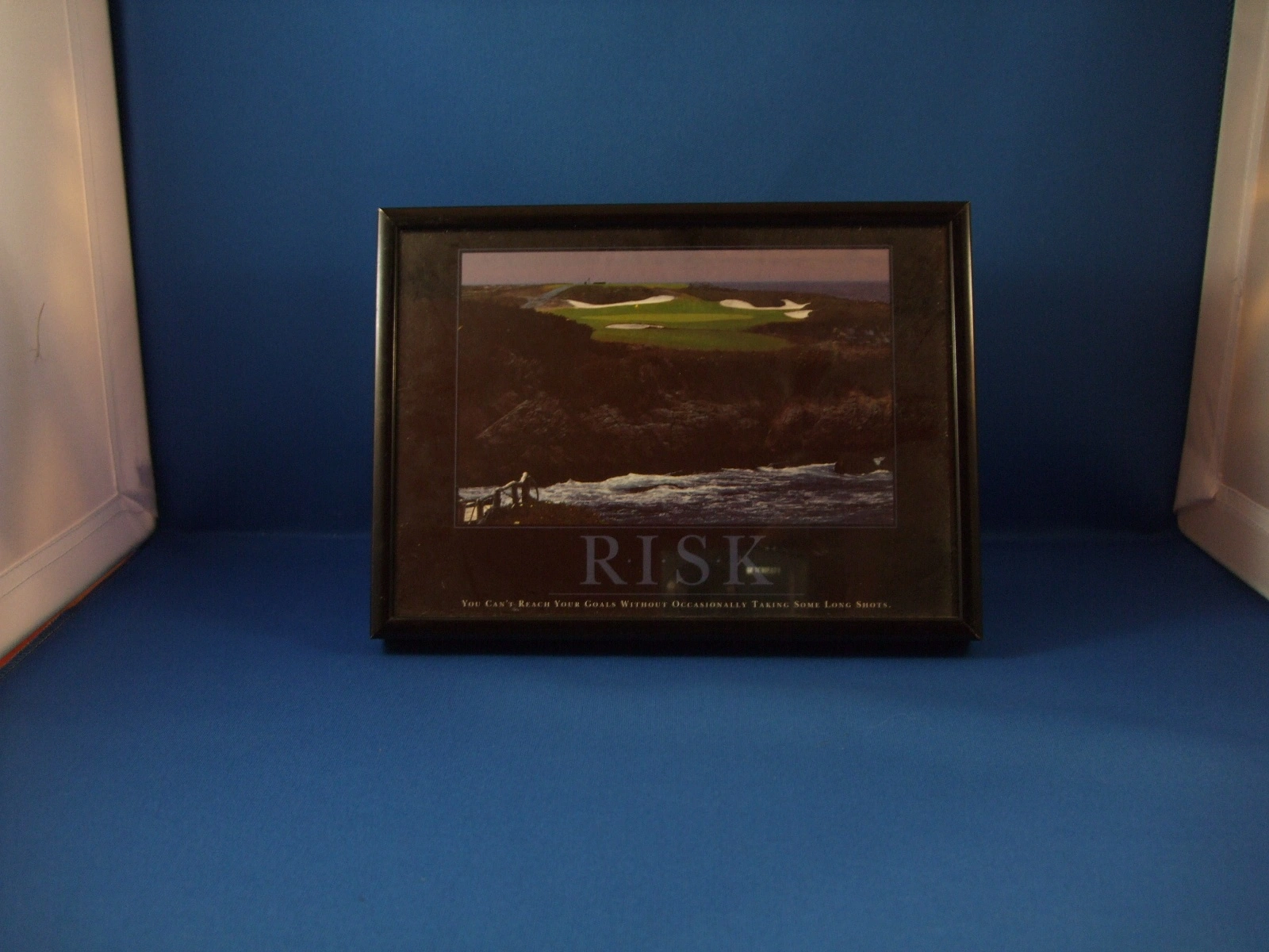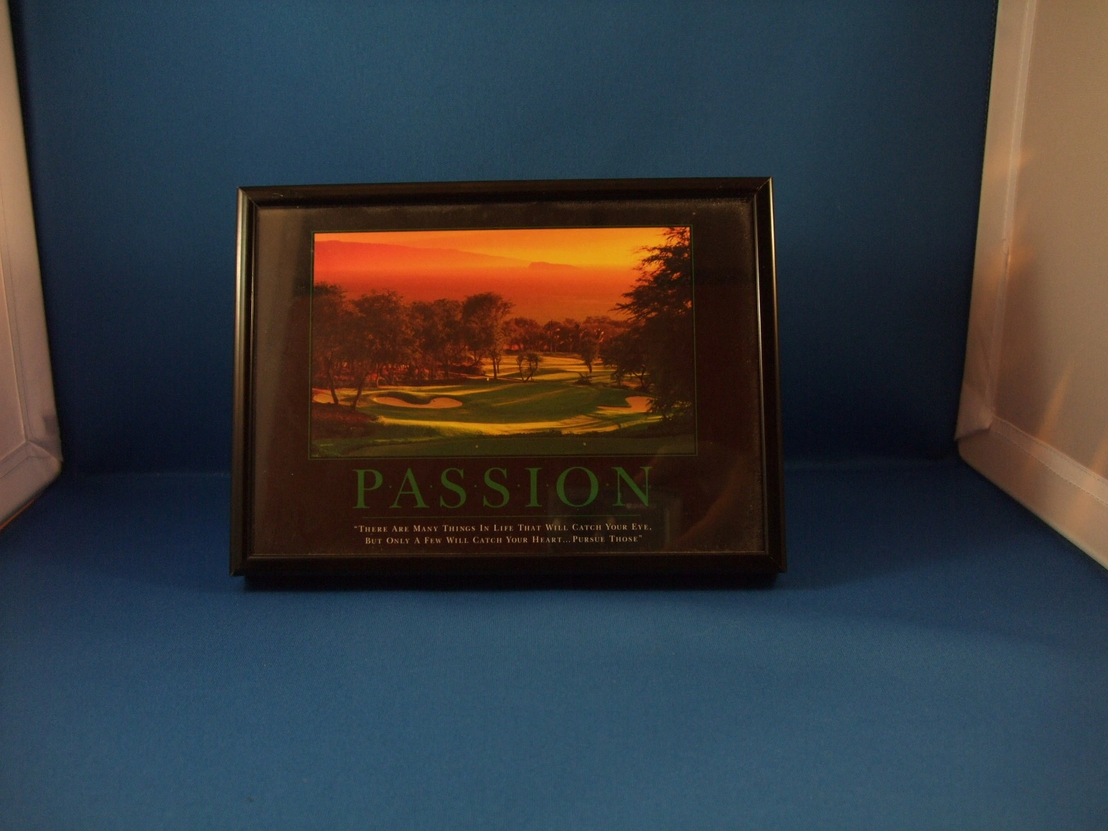Selling framed motivational posters with golf course themes. Each one has a different inspirational word: Attitude, Focus, Opportunity, Risk, and Passion. Prices for each