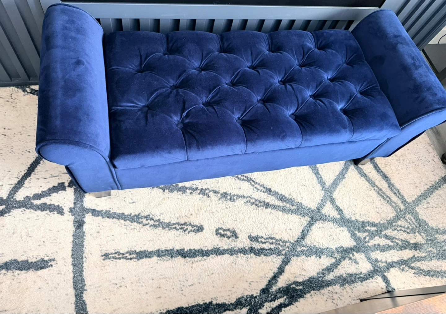 This blue velvet bench offers stylish tufted detailing and convenient storage inside. It's perfect for stashing blankets, toys, or other household items neatly away. The rich blue colour and plush velvet material add a touch of elegance to any room.