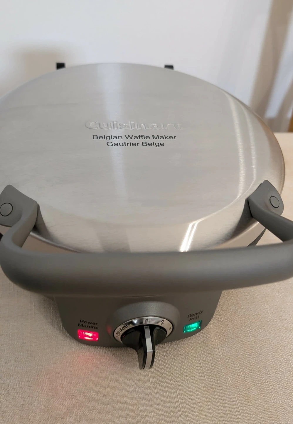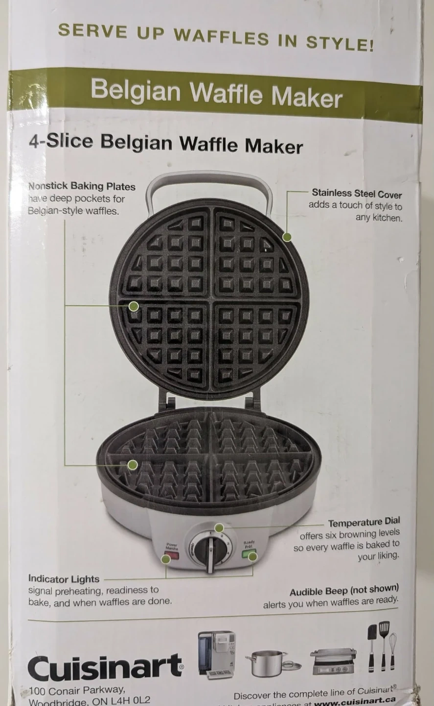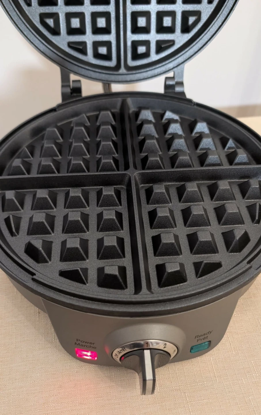 This is a 4-slice Belgian waffle maker with nonstick baking plates, so waffles don't stick. It also has a temperature dial that offers six browning levels, so every waffle is baked to your liking. The indicator lights signal preheating and when the waffles are done. It also includes an audible beep to let you know when the waffles are ready. It is BPA free.