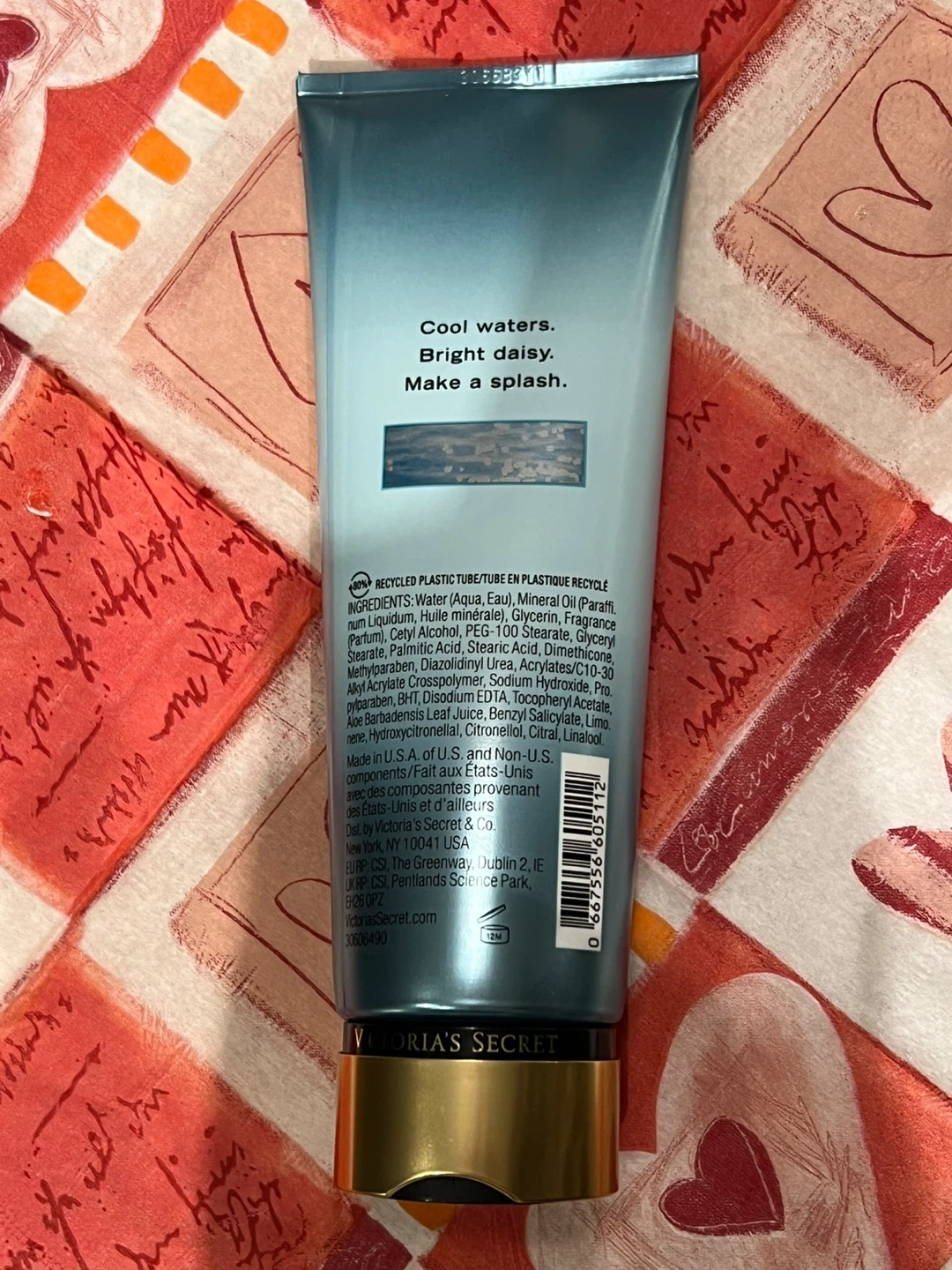 Victoria's Secret Aqua Kiss Fragrance Lotion. It's an 8 fl oz (236 ml) bottle. The lotion has a cool waters and bright daisy scent! Perfect for adding a splash of fragrance to your day