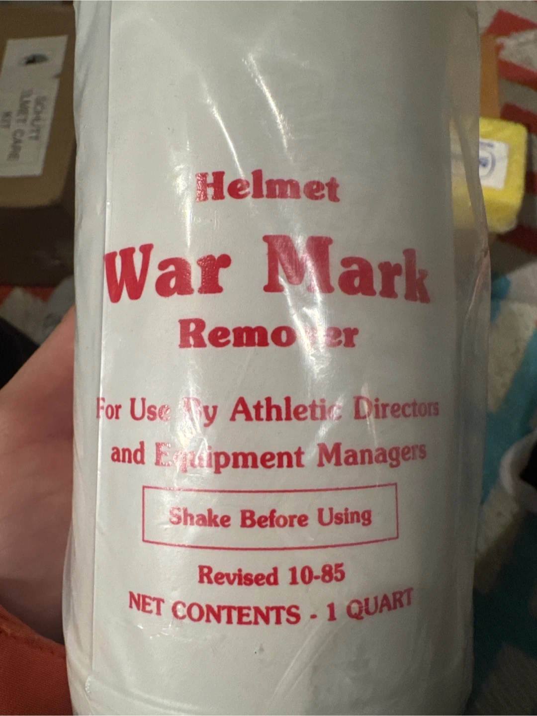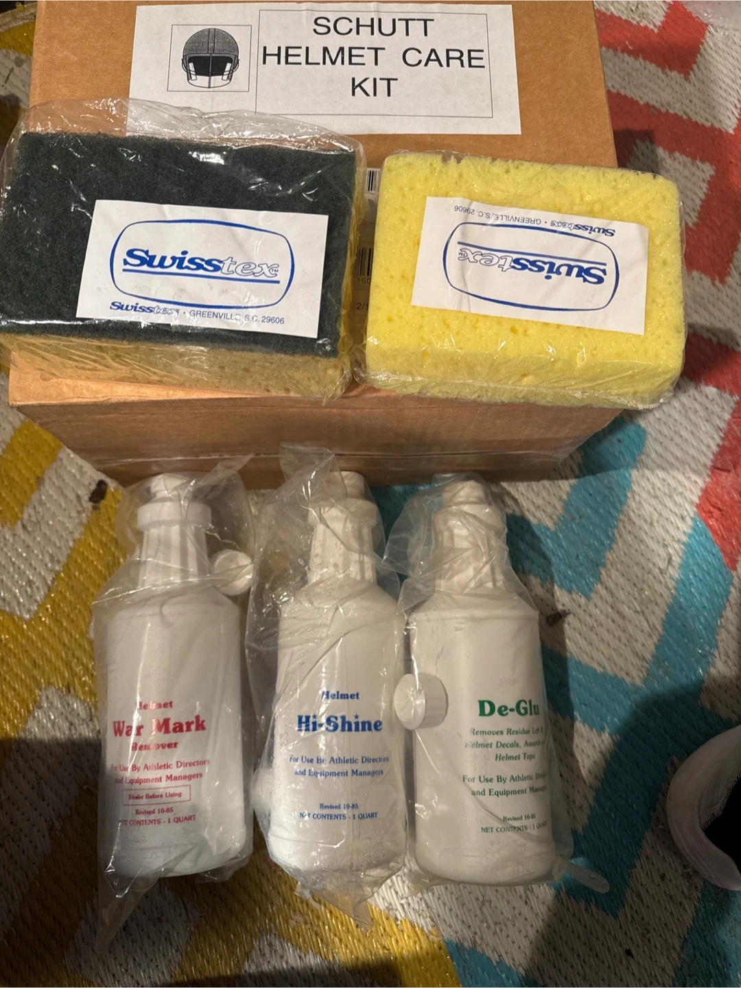 This Schutt Helmet Care Kit includes War Mark Remover, Hi-Shine polish, and De-Glu residue remover. Each bottle contains 1 quart of product. Also includes a green scrubbing pad and a yellow sponge.