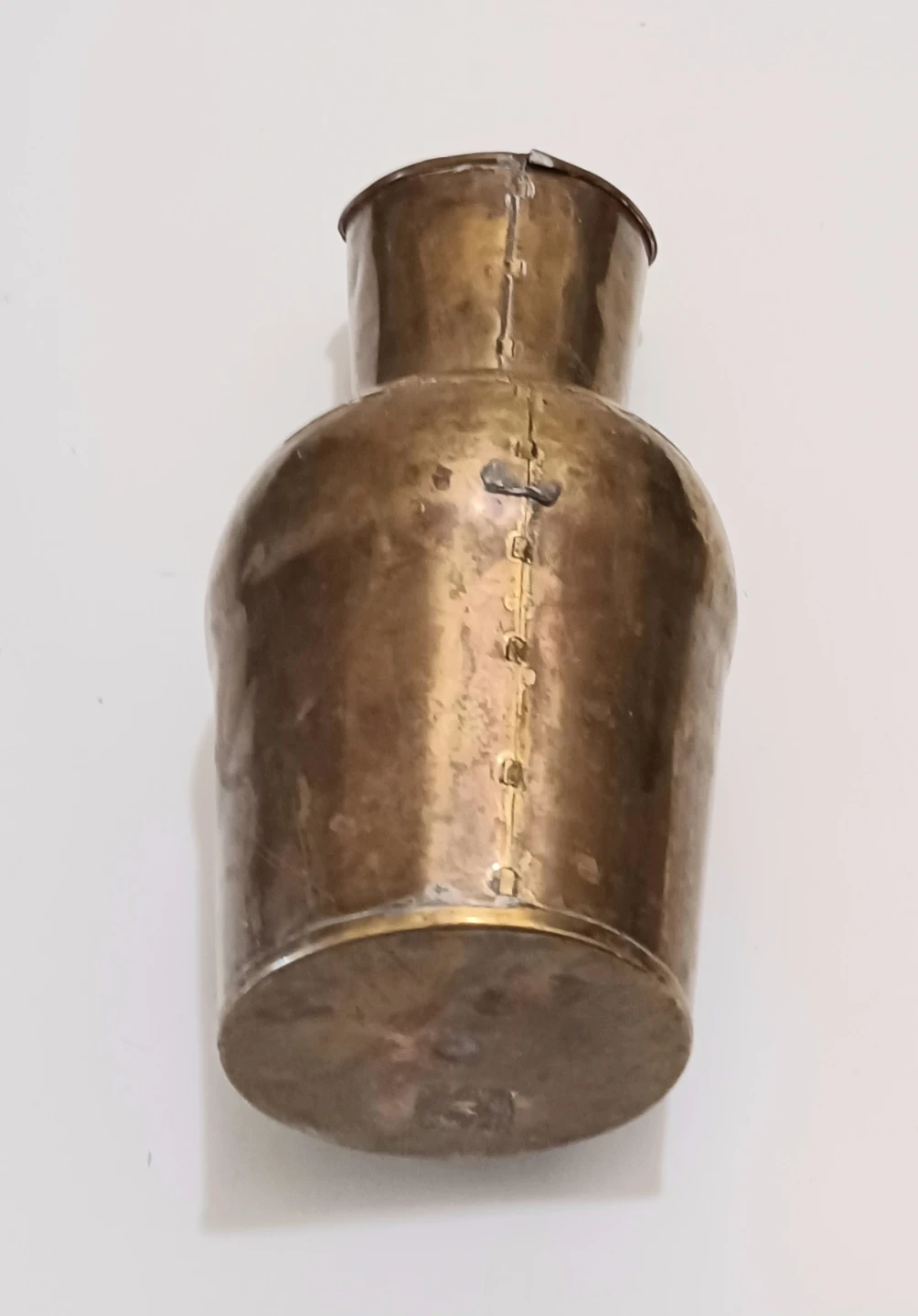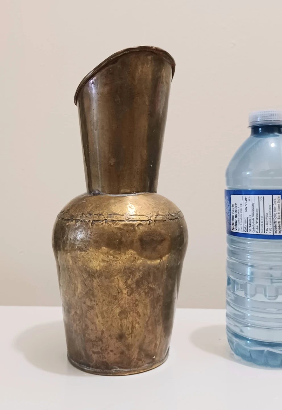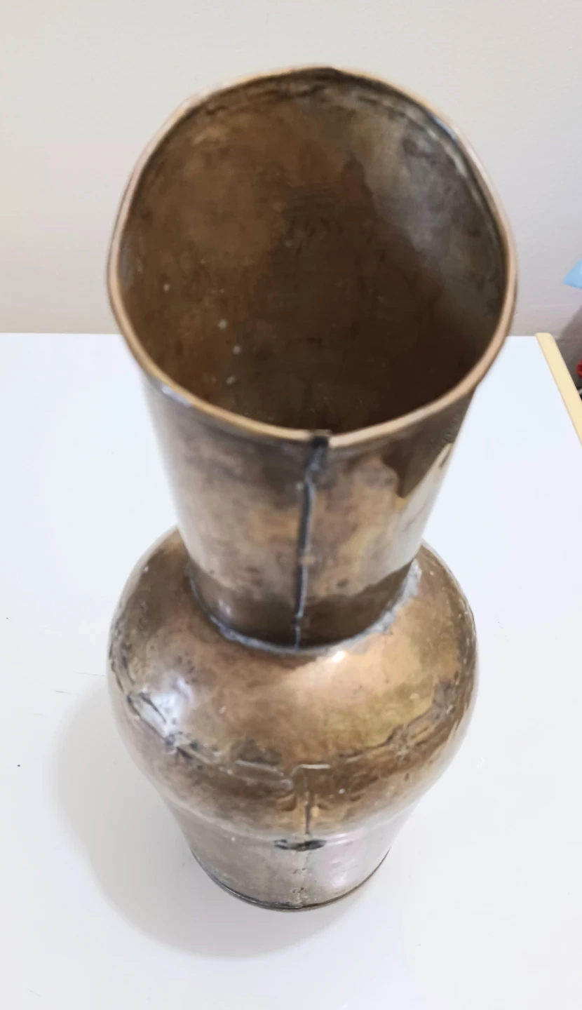 Unique vintage Hammered Brass Pitcher , Rustic, Primitive piece handcrafted, with a hammered texture and a sloped, narrow neck.