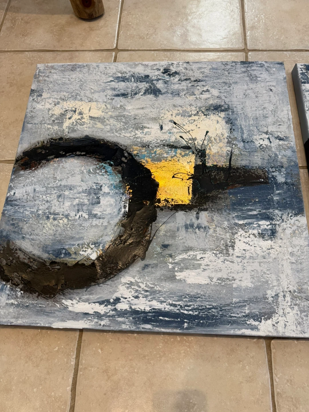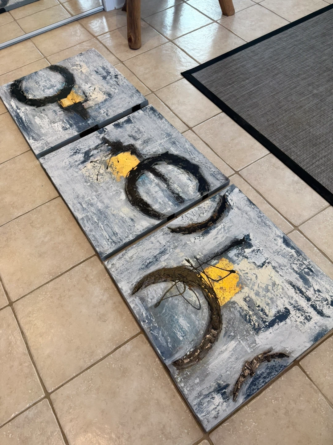 This is a set of three abstract paintings. Each canvas features a textured design with black, gold, and grey tones.