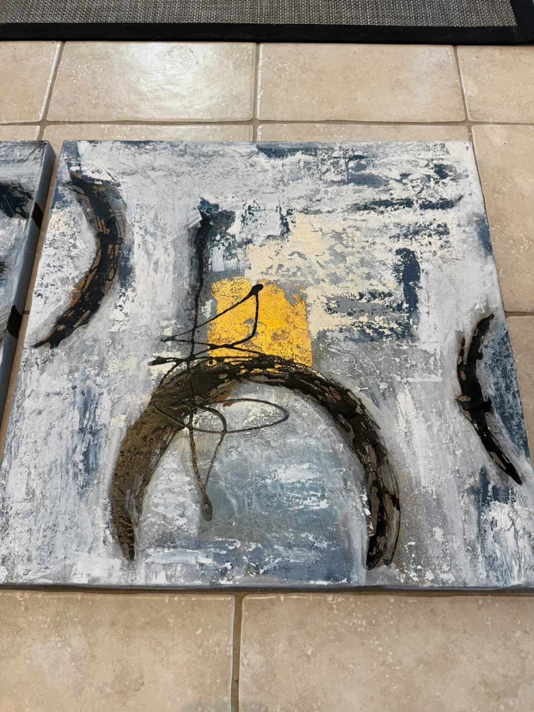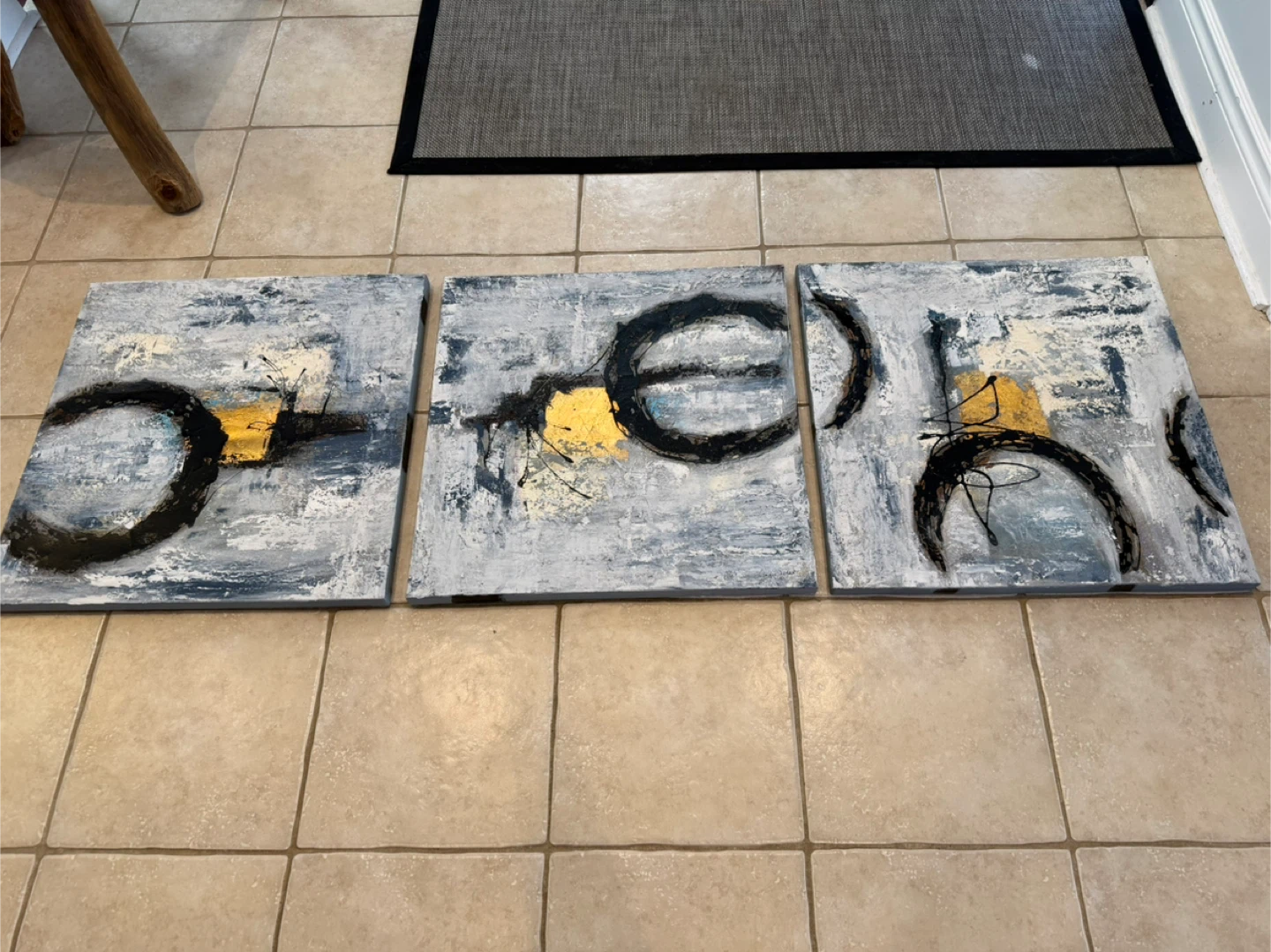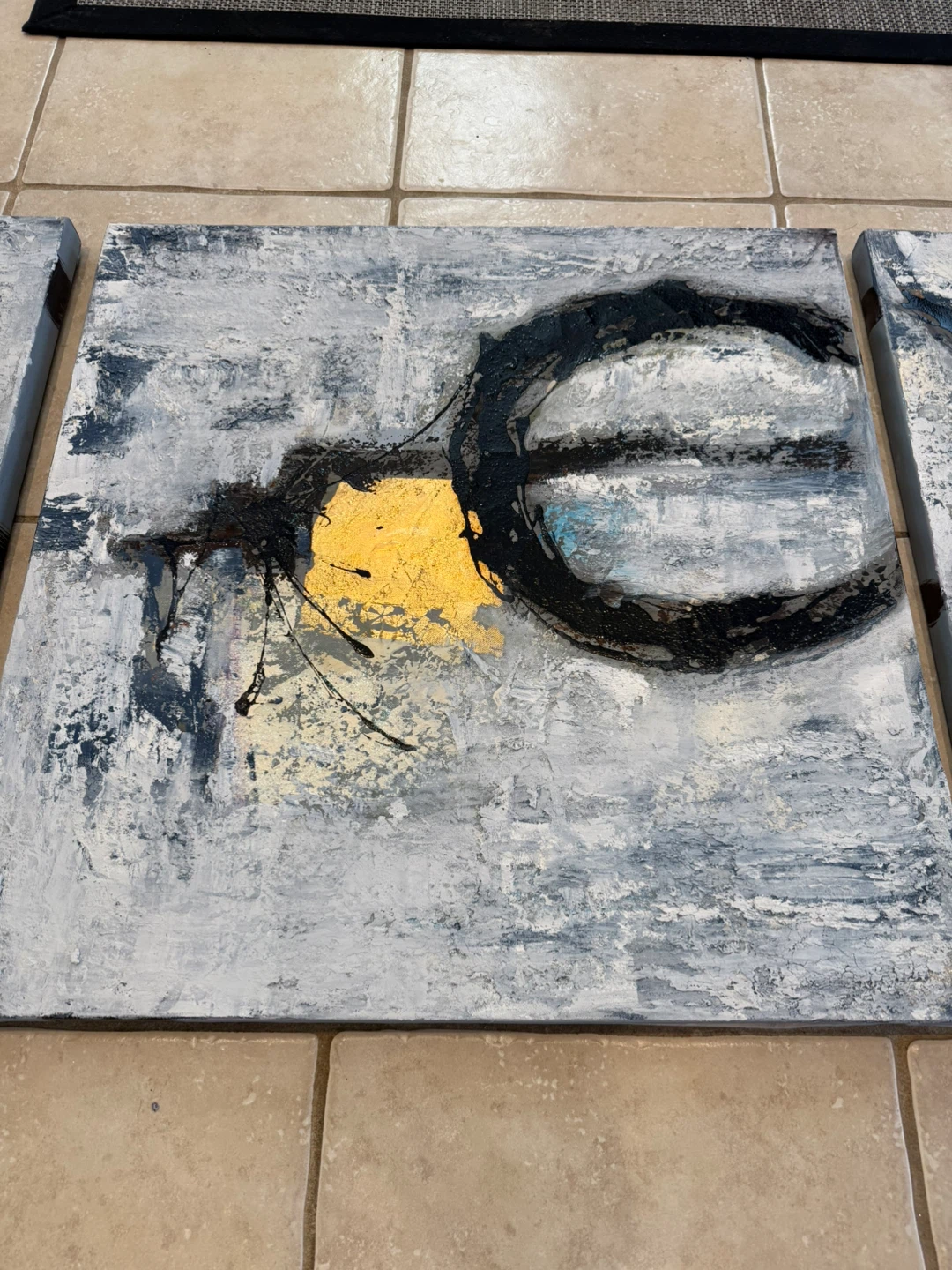This is a set of three abstract paintings. Each canvas features a textured design with black, gold, and grey tones.