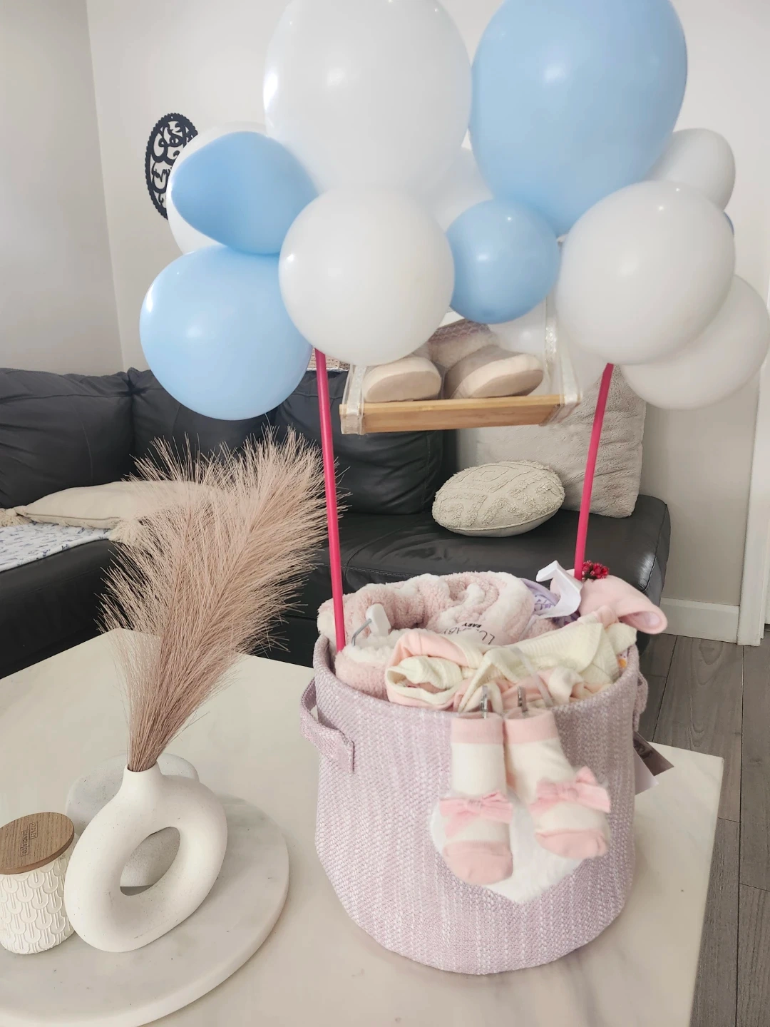 Selling a brand new Lullaby Baby gift basket! It's filled with adorable and soft baby essentials, perfect as a gift for a newborn or baby shower. Includes a cozy blanket, clothing, and socks, all in a lovely pink and white colour scheme. 3-6 months