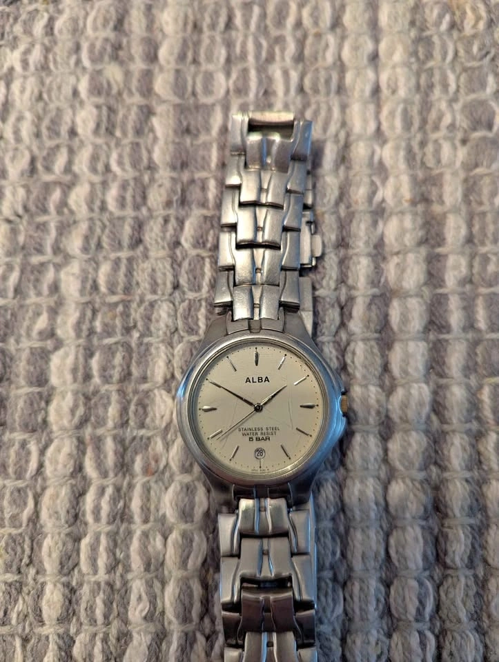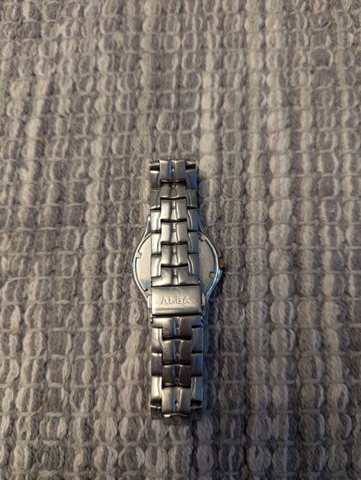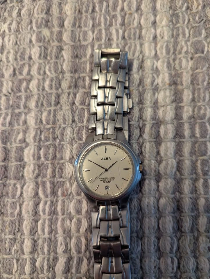 Well loved vintage Alba watch with a white dial and date window at the 6 placement. Works great just needs a new battery. $40 obo. Price negotiable.