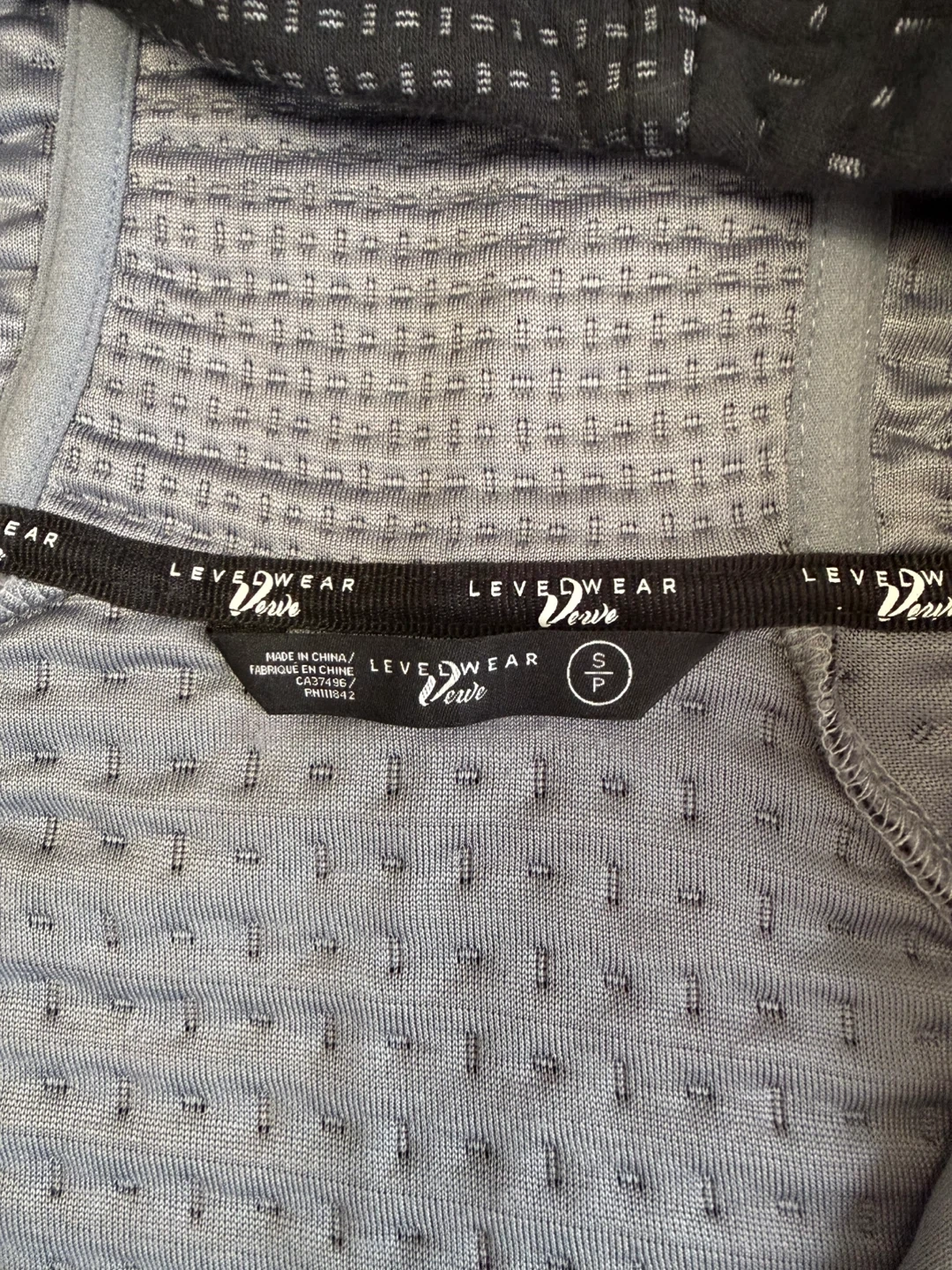 It's a size small and features a dark patterned exterior with a grey interior. Great for workouts or casual wear!