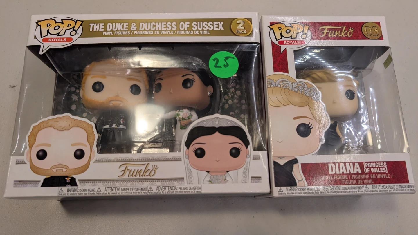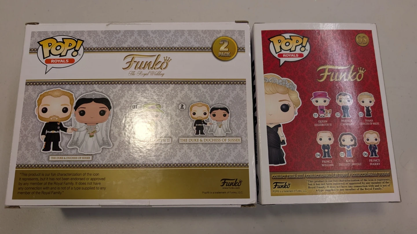 Includes the Duke and Duchess of Sussex 2-pack Funko Pop! figures, celebrating their wedding. Also includes a separate Funko Pop! figure of Diana, Princess of Wales. These vinyl figures are from the Funko Pop! Royals collection.