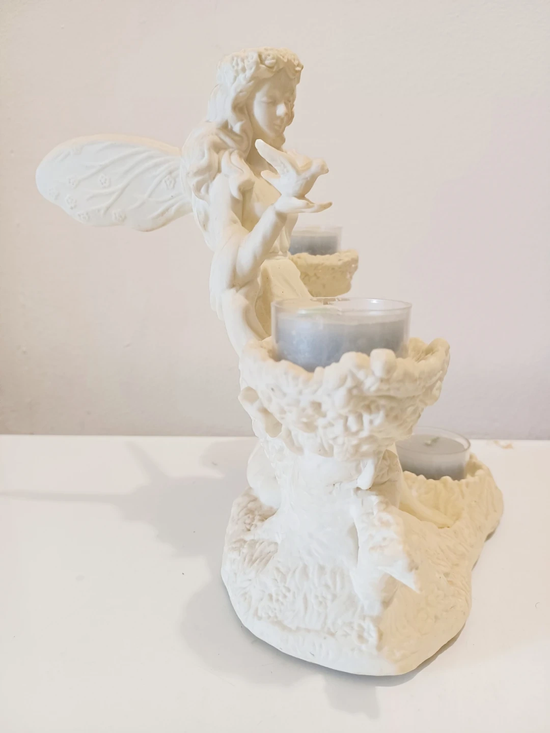 Design: An ivory-colored fairy or angel holding a bird, standing in a garden setting with three separate platforms for tea lights or votives.